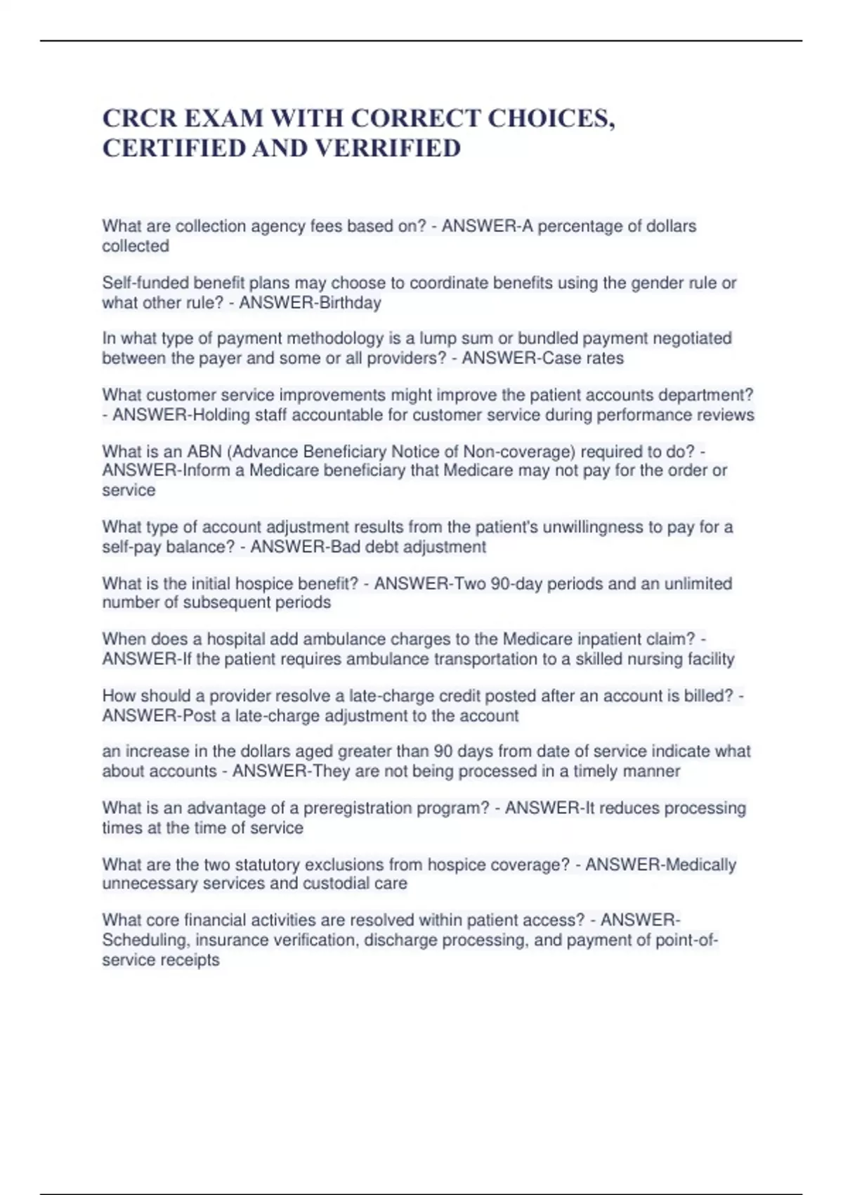 HFMA CRCR EXAM LATEST EXAM QUESTIONS AND CORRECT ANSWERS AGRADE