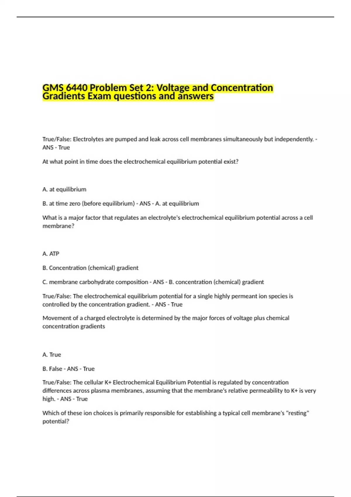 GMS 6440 Problem Set 2 Voltage and Concentration Gradients Exam questions and answers.