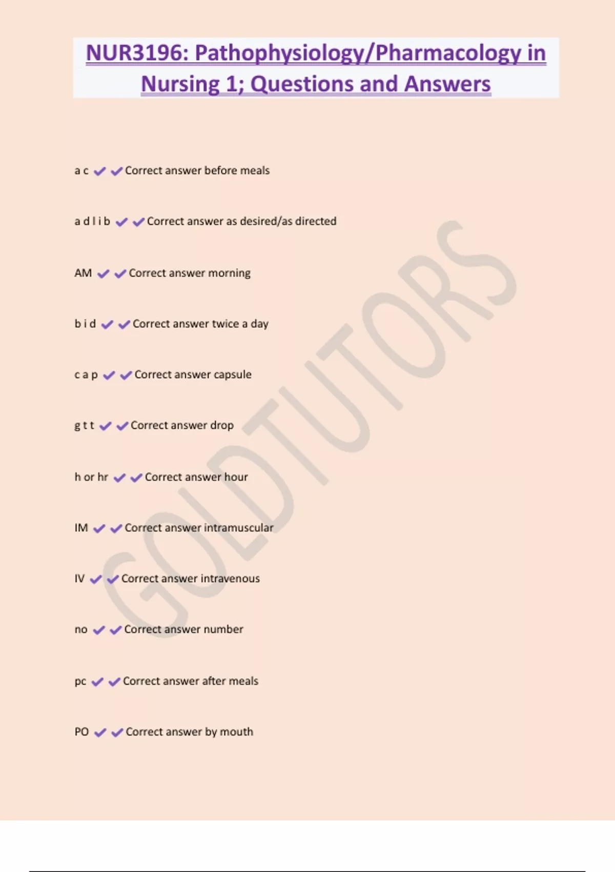 Module Quizzes - NUR3196; Questions and Answers 100% Solved 2 Exam (elaborations) NUR3196 - Comprehensive Final Exam Drugs; Questions and Answers 100% Solved 3 Exam (elaborations) NUR3196 Exam 1 nurse talk; Questions and Answers 4 Exam (elaborations) NUR3196 Exam 3 with Complete Solutions 5 Exam (elaborations) NUR3196 Exam 4 Drugs; Questions an