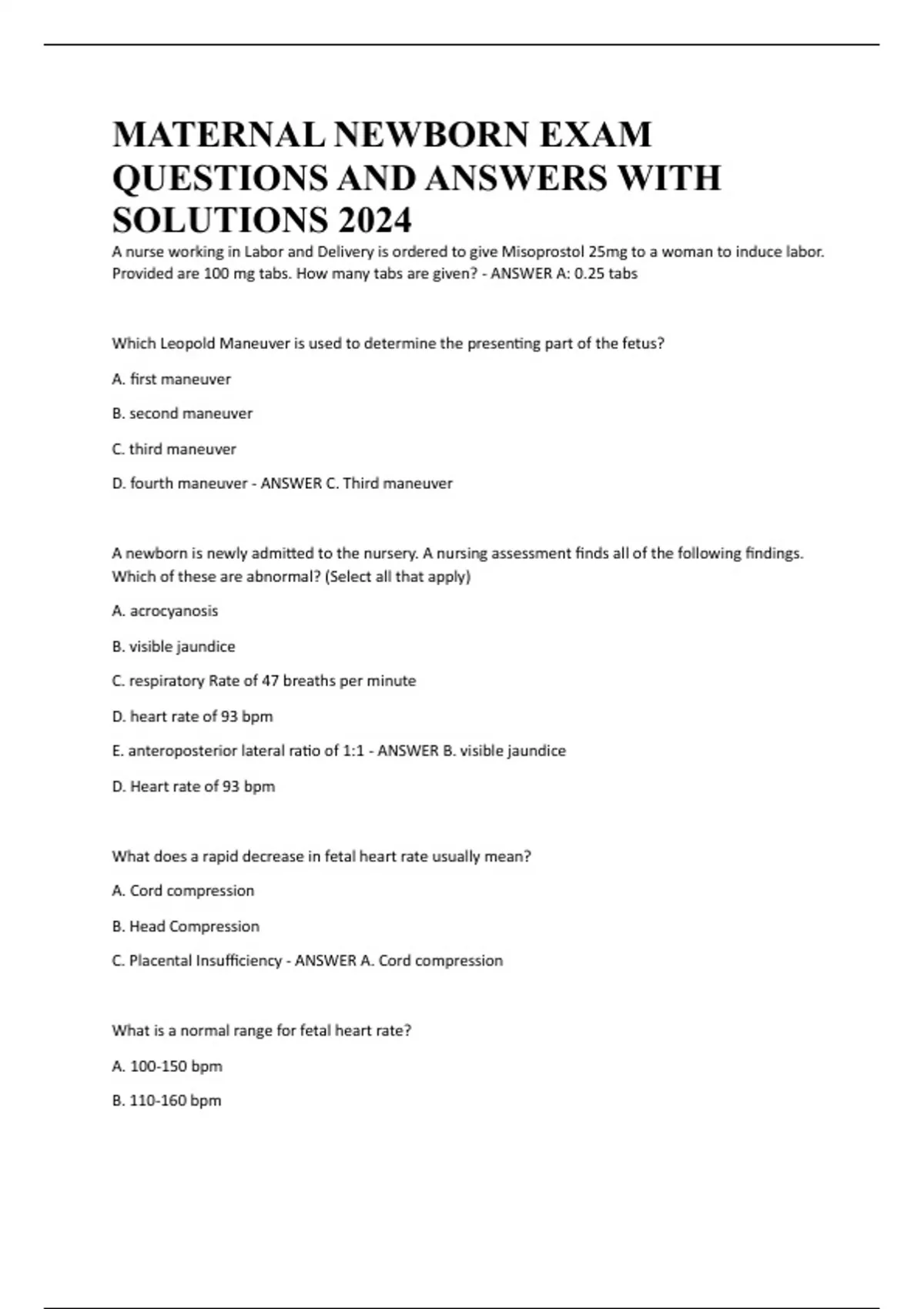 MATERNAL NEWBORN PACKAGE DEAL QUESTIONS AND ANSWERS WITH VERIFIED SOLUTIONSUPDATED 2024