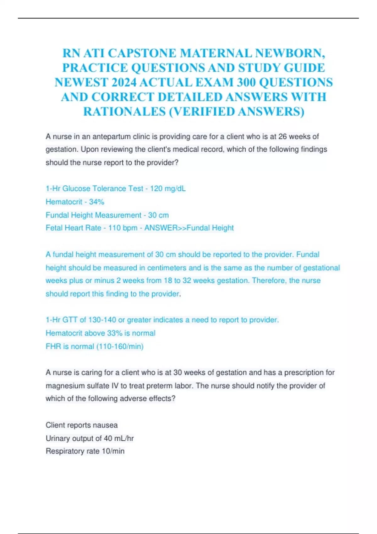 RN ATI CAPSTONE MATERNAL NEWBORN, PRACTICE QUESTIONS AND STUDY GUIDE NEWEST 2024 ACTUAL EXAM 300 QUESTIONS AND CORRECT DETAILED ANSWERS WITH RATIONALES (VERIFIED ANSWERS)
