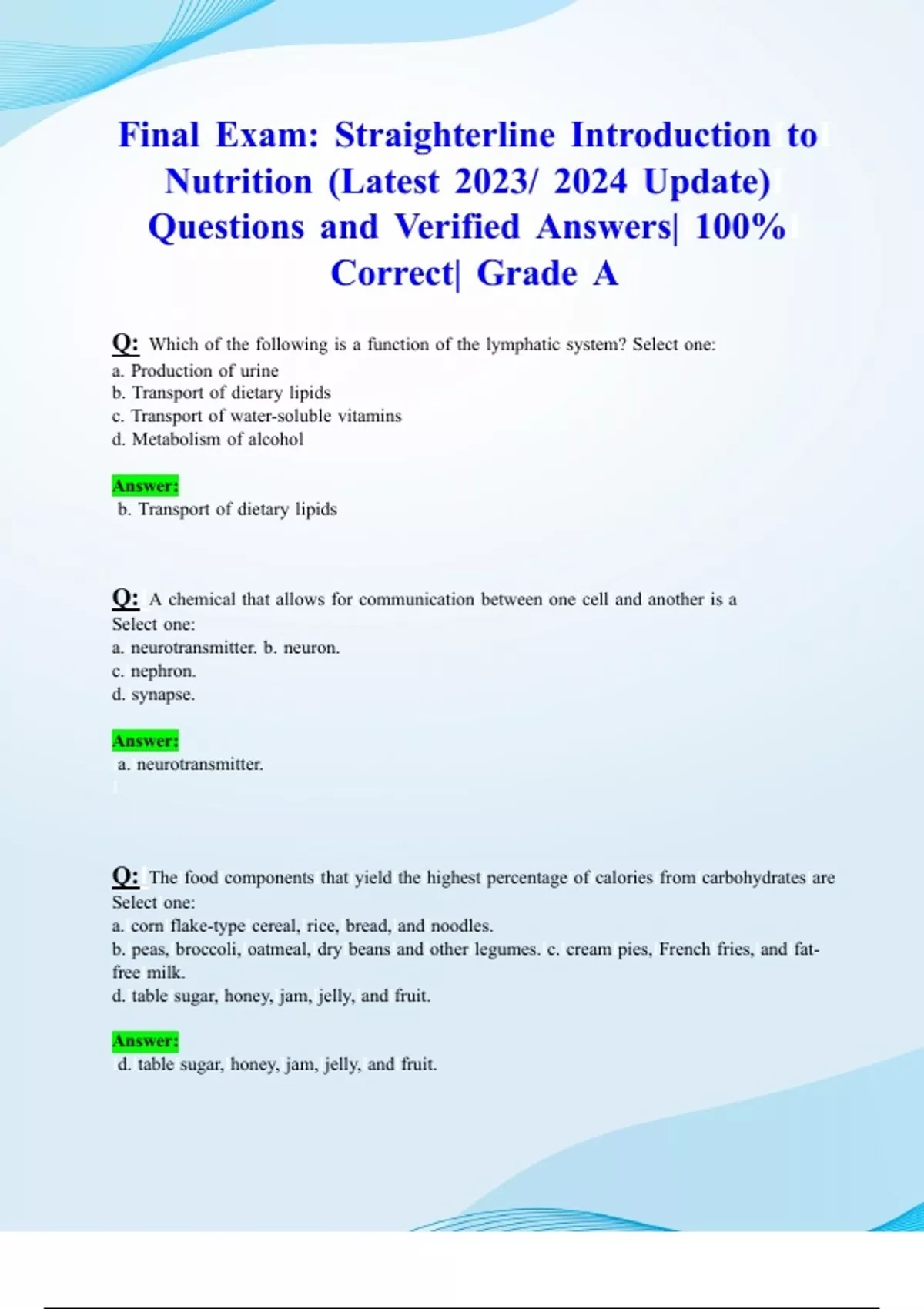 Final Exam: Straighterline Introduction to Nutrition (Latest 2024/ 2025 Update) Questions and Verified Answers| 100% Correct| Grade A