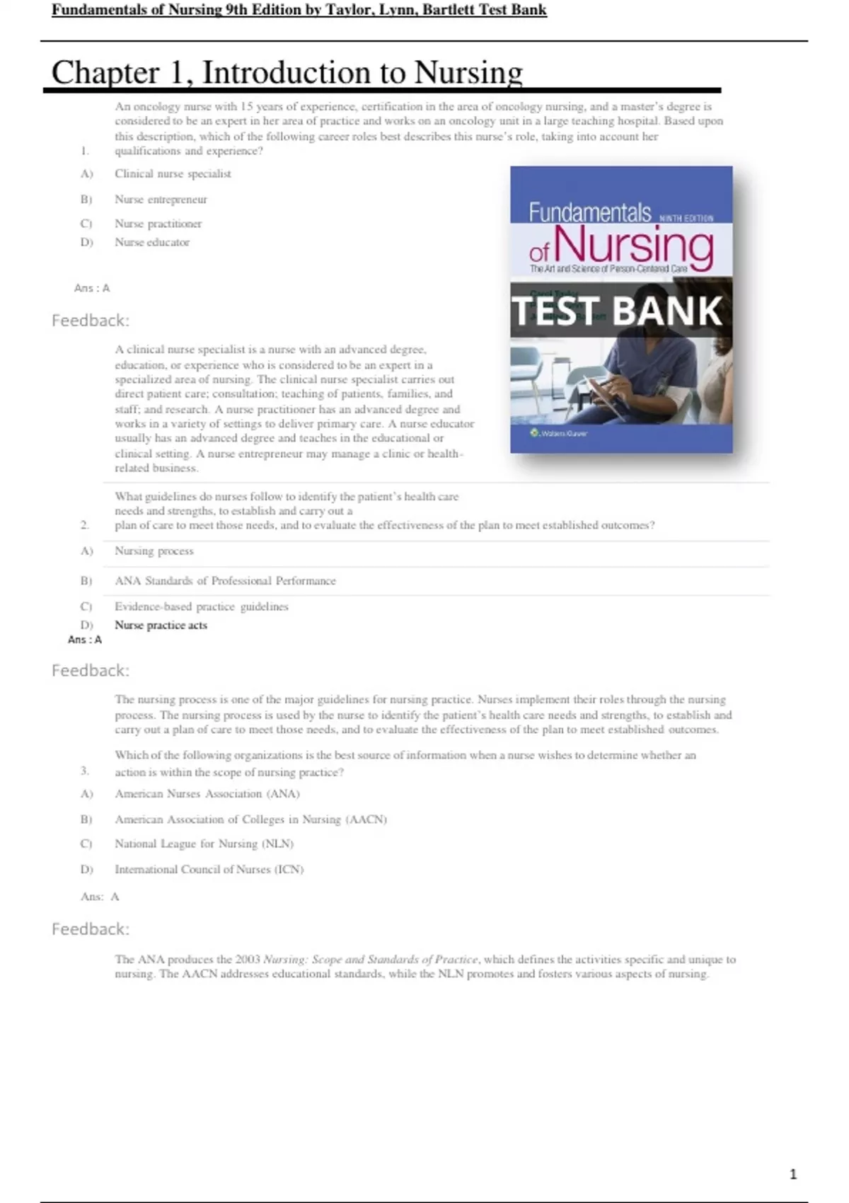 Fundamentals of Nursing 9thand 10th Editions by Taylor, Lynn, Bartlett Test Bank All Chapters (1-46) | A+ ULTIMATE GUIDE