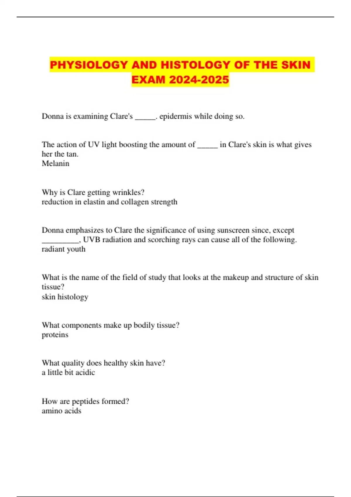 PHYSIOLOGY AND HISTOLOGY OF THE SKIN EXAM WITH QUESTIONS AND ANSWERS