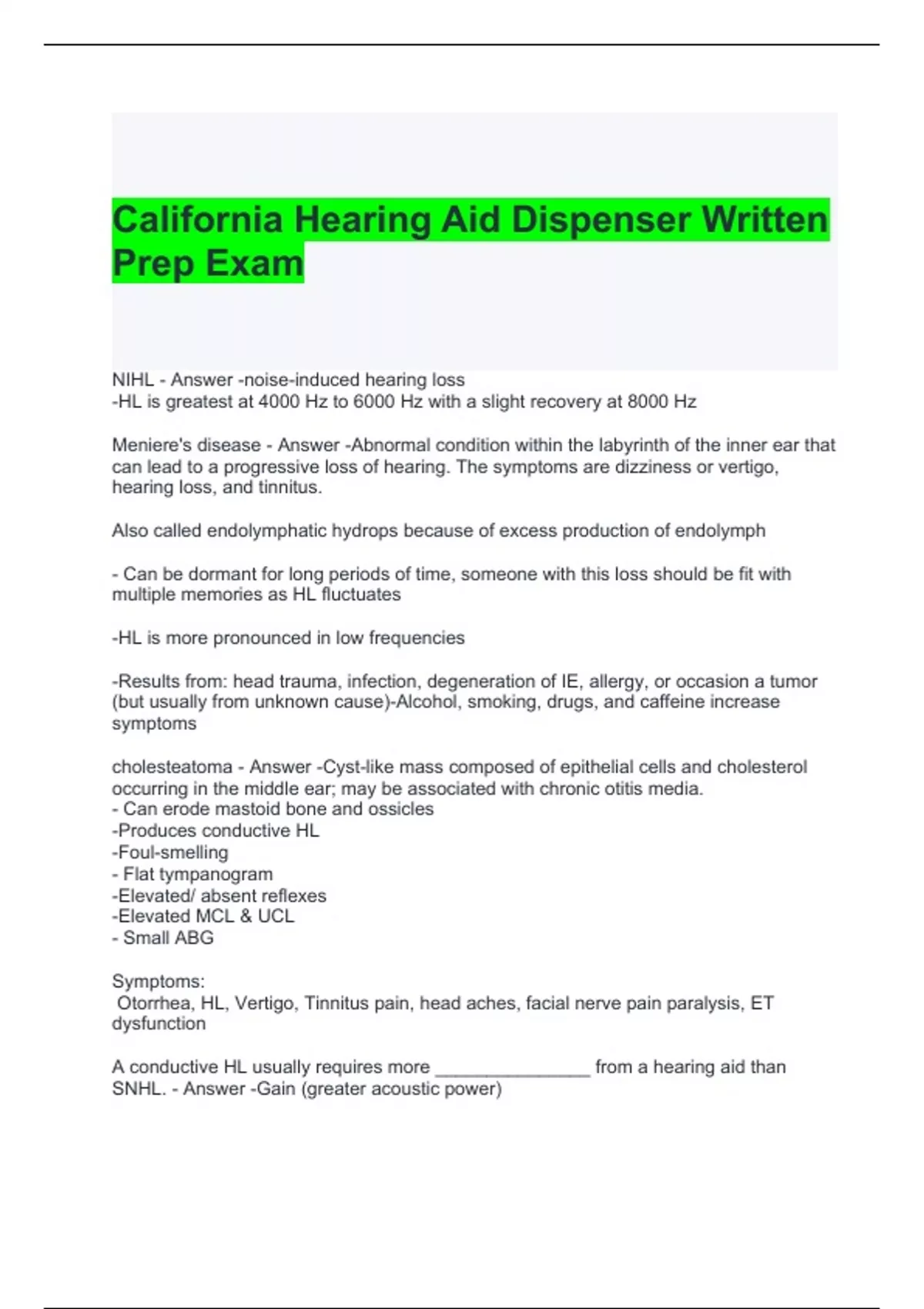 1 Exam (elaborations) Practical Exam-Hearing Aid Dispenser Questions and Answers 2 Exam (elaborations) Hearing Aid Dispenser-The Human Ear-Anatomy Exam 2024 3 Exam (elaborations) Hearing Aid Dispenser-s Written Exam Questions and Answers 4 Exam (elaborations) Hearing Aid Dispenser-Hearing Disorders Exam Questions and Answers 5 Exam (elaboration