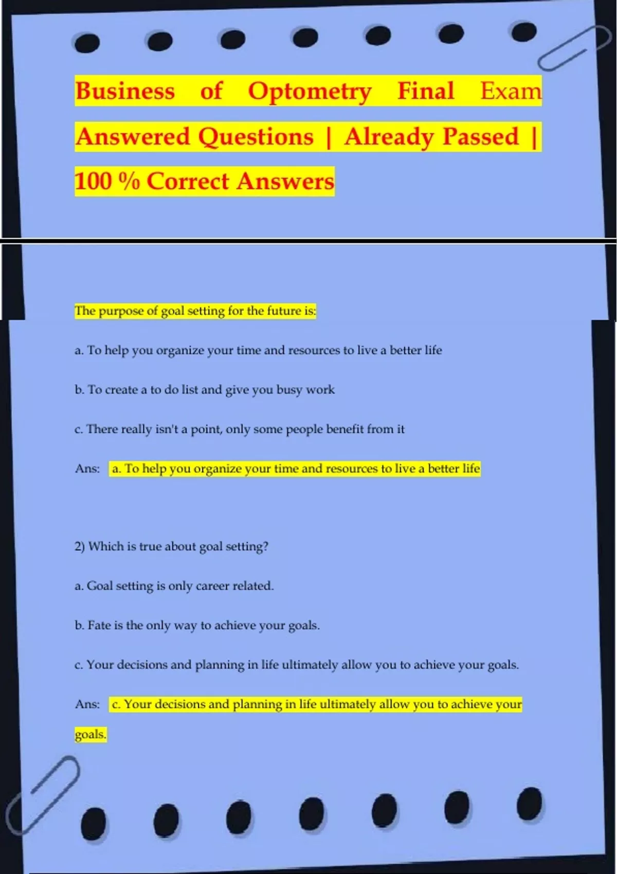 Business of Optometry Final Exam Answered Questions | Already Passed | 100 % Correct Answers The purpose of goal setting for the future is: a. To help you organize your time and resources to live a better life b. To create a to do list and give you bus
