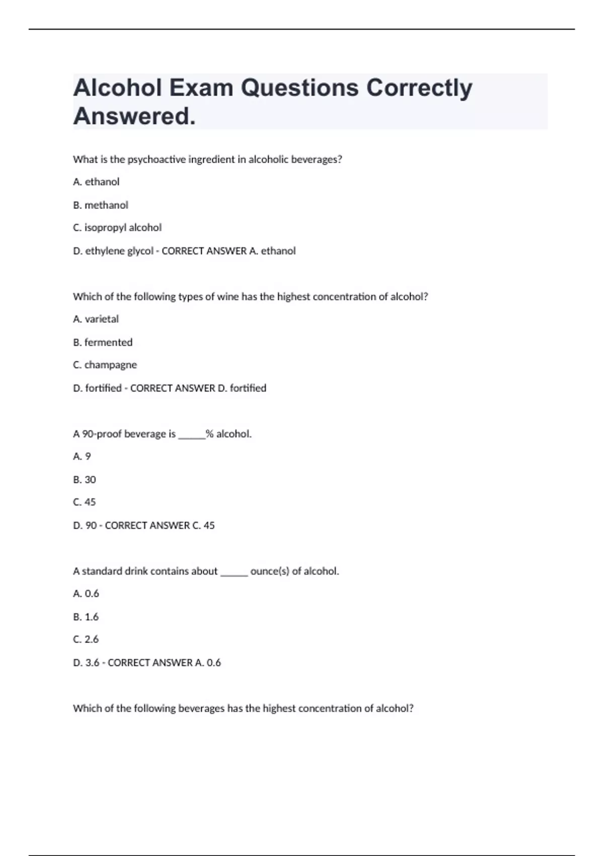 ALCOHOL BUNDLE PACK ,EXAM QUESTIONS CORRECTLY ANSWERED WITH VERIFIED ANSWERS.