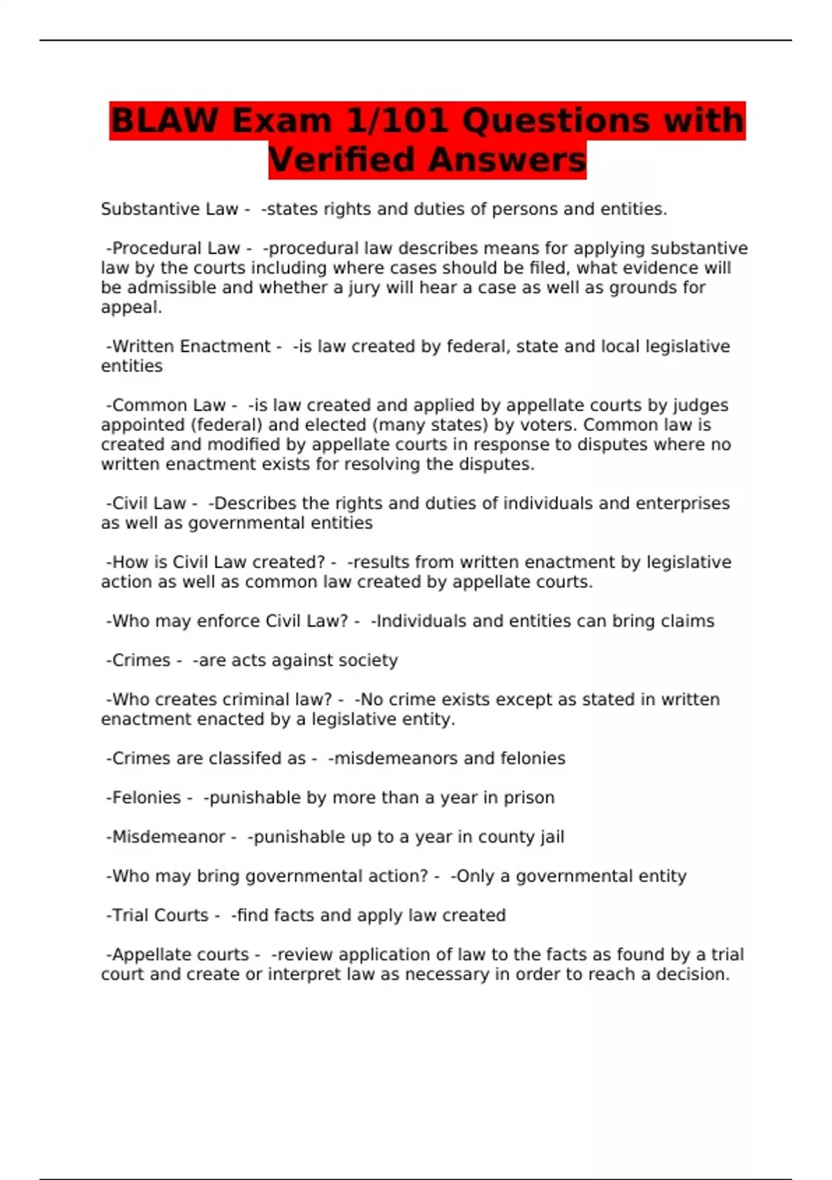 BLAW Test #1 Multiple Choice Exam Questions and Answers