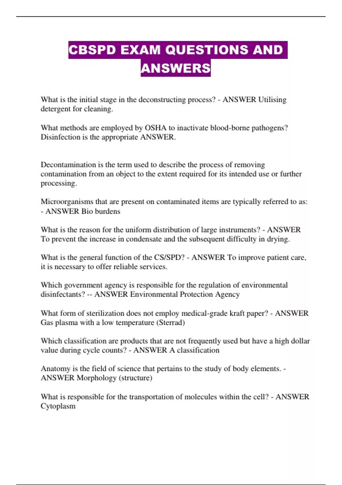 CBSPD; Chapter 10; Sterilization TEST With Questions and Answers