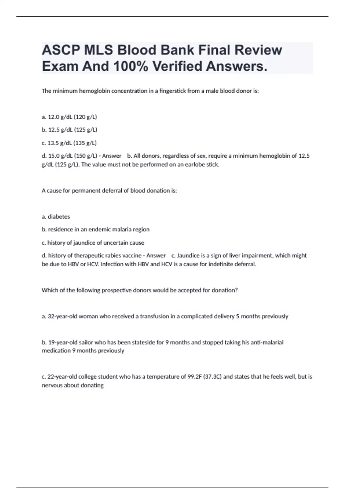 1 Exam (elaborations) BLOOD BANK STUDY GUIDE EXAM QUESTIONS AND ACTUAL ANSWERS. 2 Exam (elaborations) Introduction to Blood Bank Midterm Exam Questions With Correct Answers. 3 Exam (elaborations) Blood Bank chapter 9, 15, 16 Multi Choice Questions Fully Answered. 4 Exam (elaborations) NCA Blood Bank Test Questions With Complete Solutions.