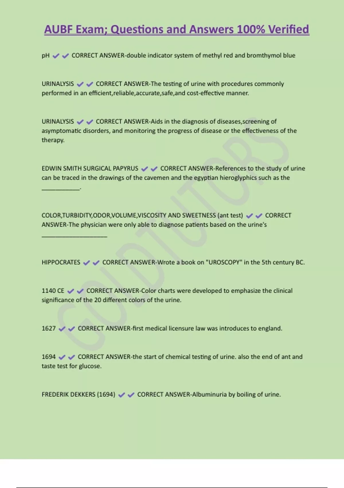 AUBF; Strasinger - PART 1_Chapter 2: Introduction to Urinalysis; Questions and Answers 100% Verified 2 Exam (elaborations) AUBF; Strasinger - PART 2_Chapter 4: Physical Examination of Urine; Questions and Answers 100% Verified 3 Exam (elaborations) Strasinger AUBF - CSF (Multiple choice); Questions and Answers 100% Verified 4 Exam (elaborations)