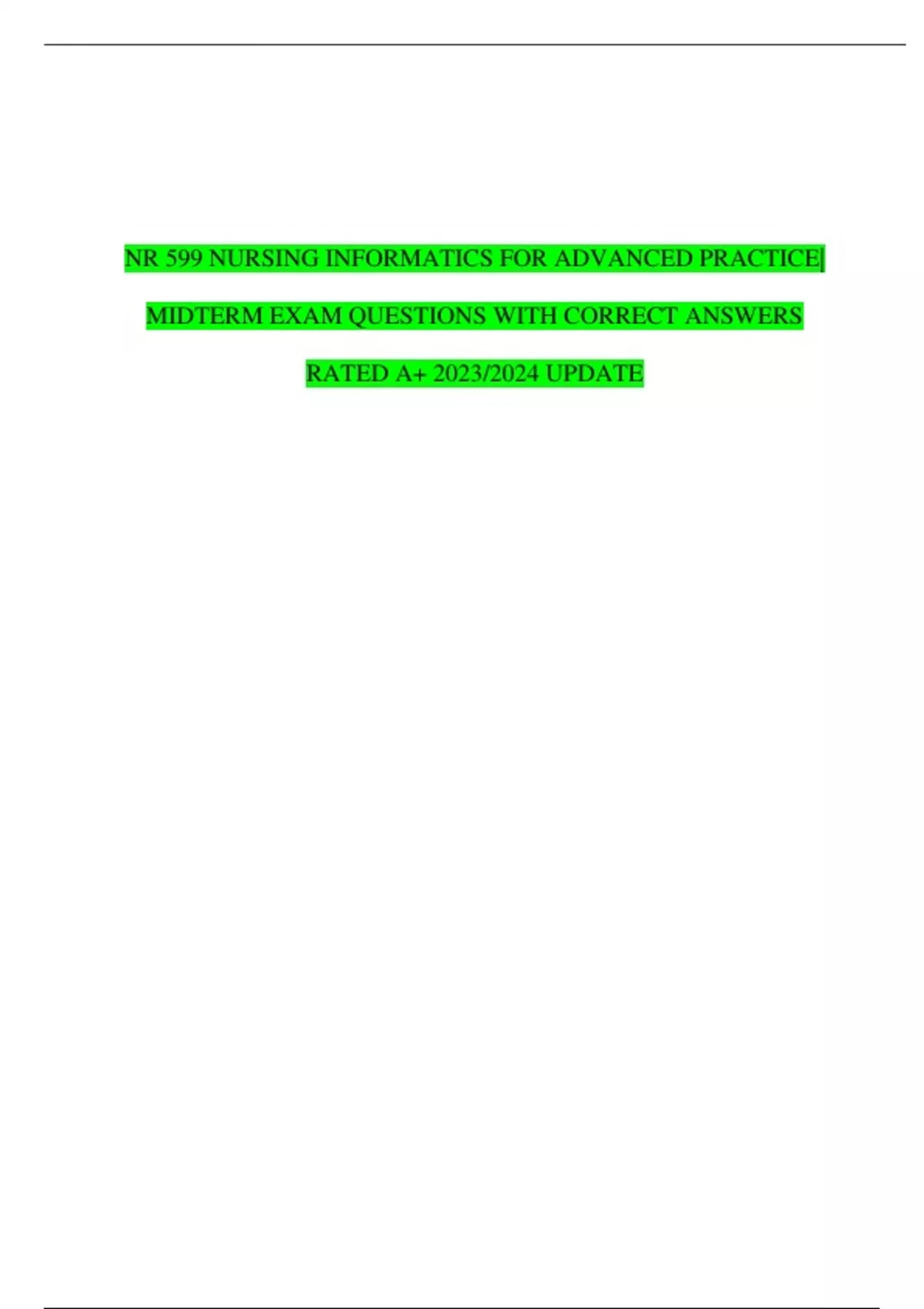 Chamberlain NR599 Informatics Midterm; Questions and Answers 100% Correct 2 Exam (elaborations) Chamberlain NR599 Midterm; Questions and Answers 100% Correct 3 Exam (elaborations) NR599 Final Exam Study Guide; Questions and Answers 100% Correct 4 Exam (elaborations) NR599 Final Exam; Questions and Answers 100% Correct 5 Exam (elaborations) NR59