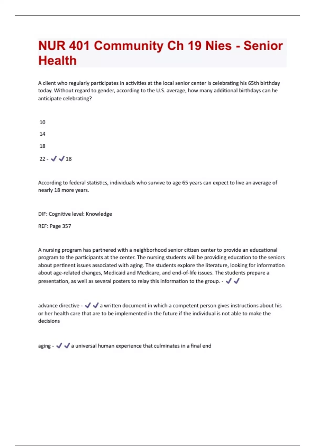 NUR 401 Community Ch 19 Nies - Senior Health Questions And Answers (2024/ 2025) (Verified Answers)