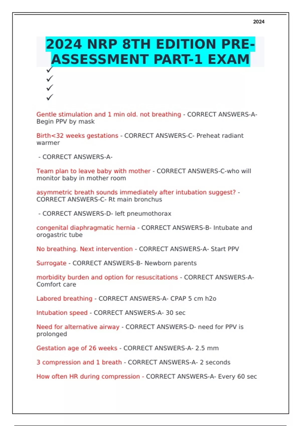 2024 NEONATAL RESUSCITATION PROGRAM (NRP) PRACTICE EXAM WITH CORRECT ANSWERS 2024 ADVANCED NRP 8TH EDITION (1-11) PROVIDER CURRICULUM EXAM 2024 NRP 8TH EDITION TEST EXAM  2024 NRP 8TH EDITION STUDY GUIDE EXAM 2024 NRP 8TH EDITION EXAM 2024 NRP 8TH EDITION FINAL EXAM 2024 NRP 8TH EDITION TEST EXAM 2024 NRP 8TH EDITION CH 1-4 EXAM 2024 NRP 8TH EDITI