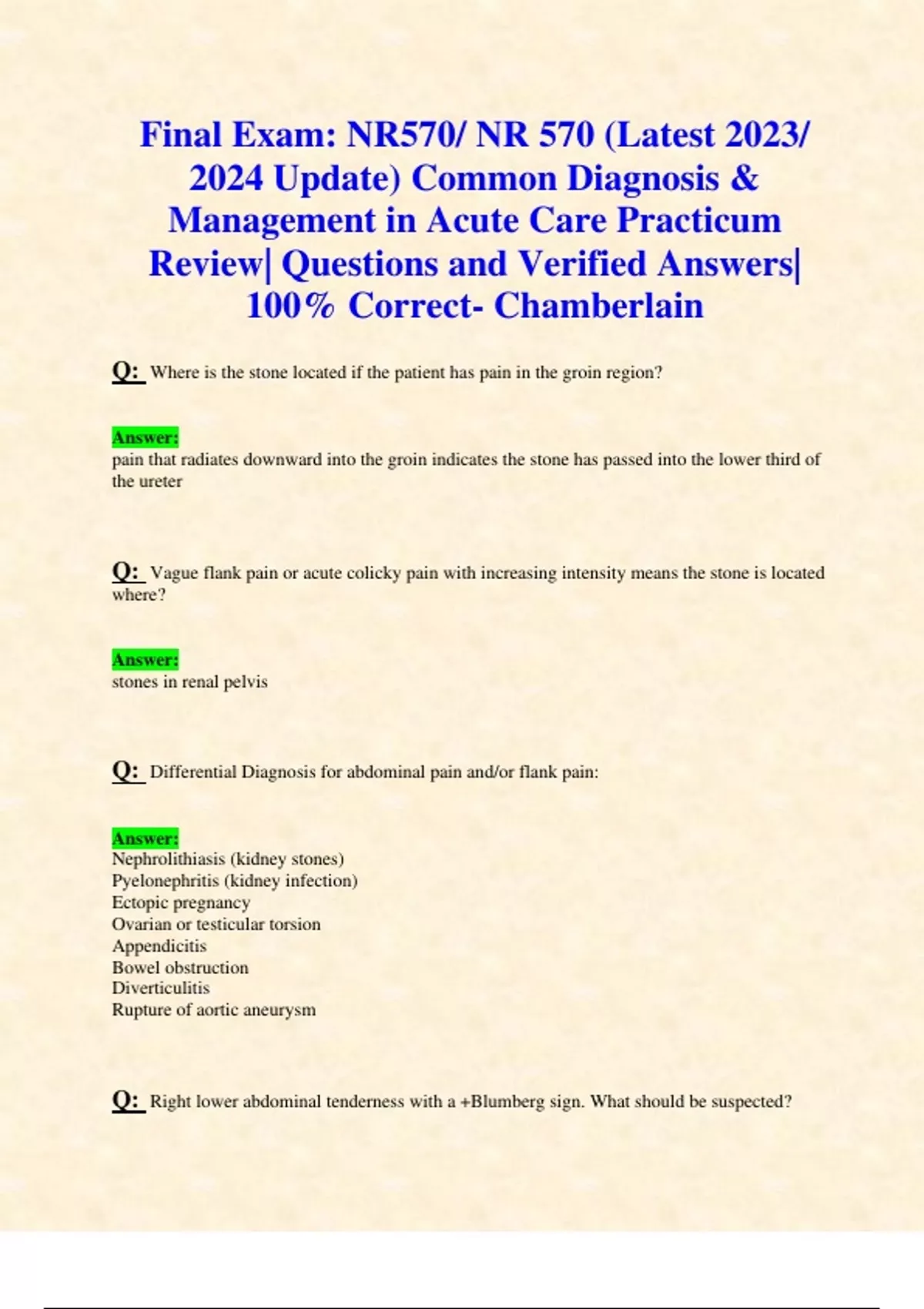 Final Exam: NR570/ NR 570 (Latest 2023/ 2024 Update) Common Diagnosis & Management in Acute Care Practicum Review| Questions and Verified Answers| 100% Correct- Chamberlain