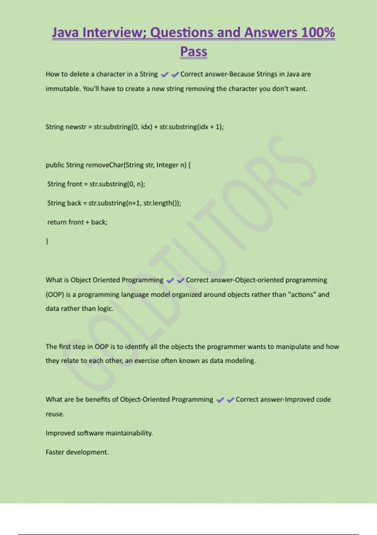 Entry-level Java Programming Interview; Questions and Answers 100% Pass 2 Exam (elaborations) Interview Questions (Java Developer); Questions and Answers 100% Pass 3 Exam (elaborations) Java Developer OCA; Questions and Answers 100% Pass 4 Exam (elaborations) Java Developer OCA; Questions and Answers 100% Pass 5 Exam (elaborations) Java Intervi