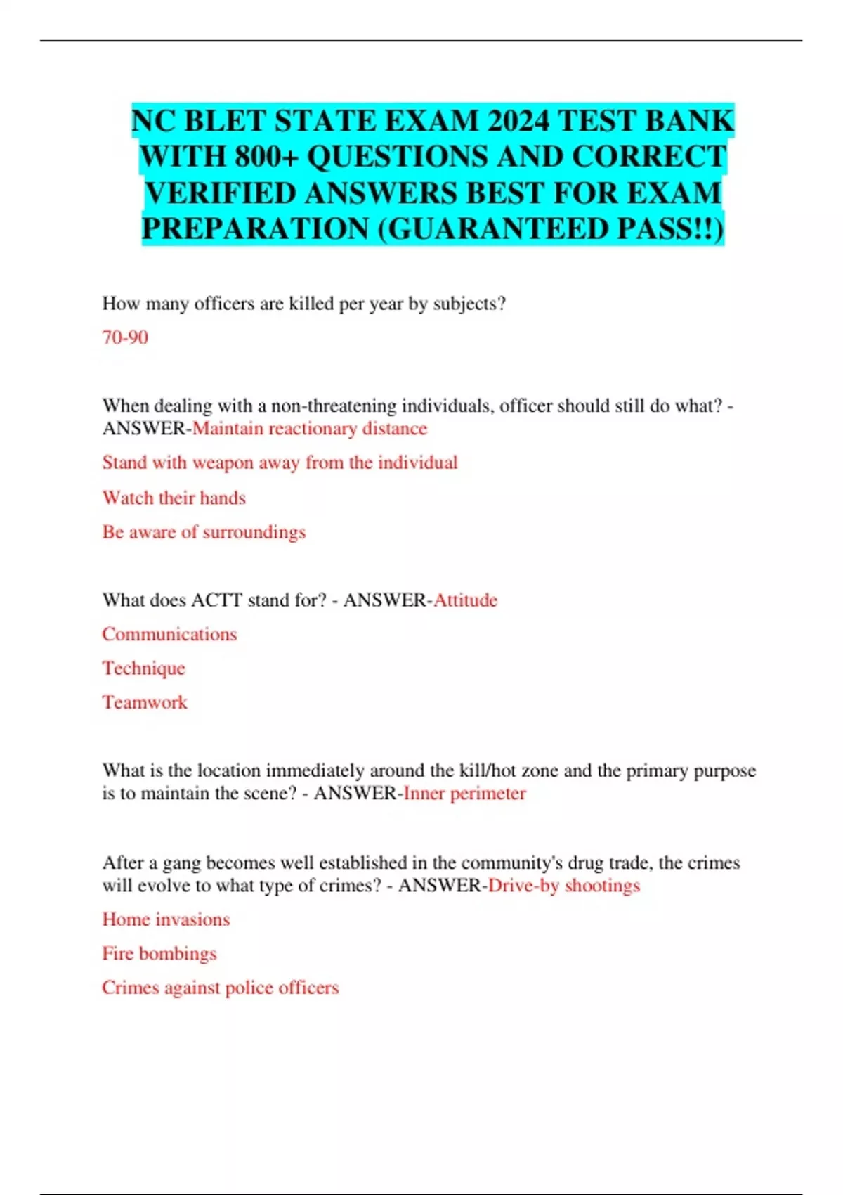 NC BLET STATE EXAM, NC BLET FIREARMS, NC BLET MOTOR VEHICLES & NC BLET CIVIL PROCESS EXAMS BUNDLE WITH ACTUAL EXAM QUESTIONS AND 100% CORRECT ANSWERS/ NORTH CAROLINA BASIC LAW ENFORCEMENT TRAINING EXAMS – NC BLET EXAMS 2024/2025(NEWEST!!)