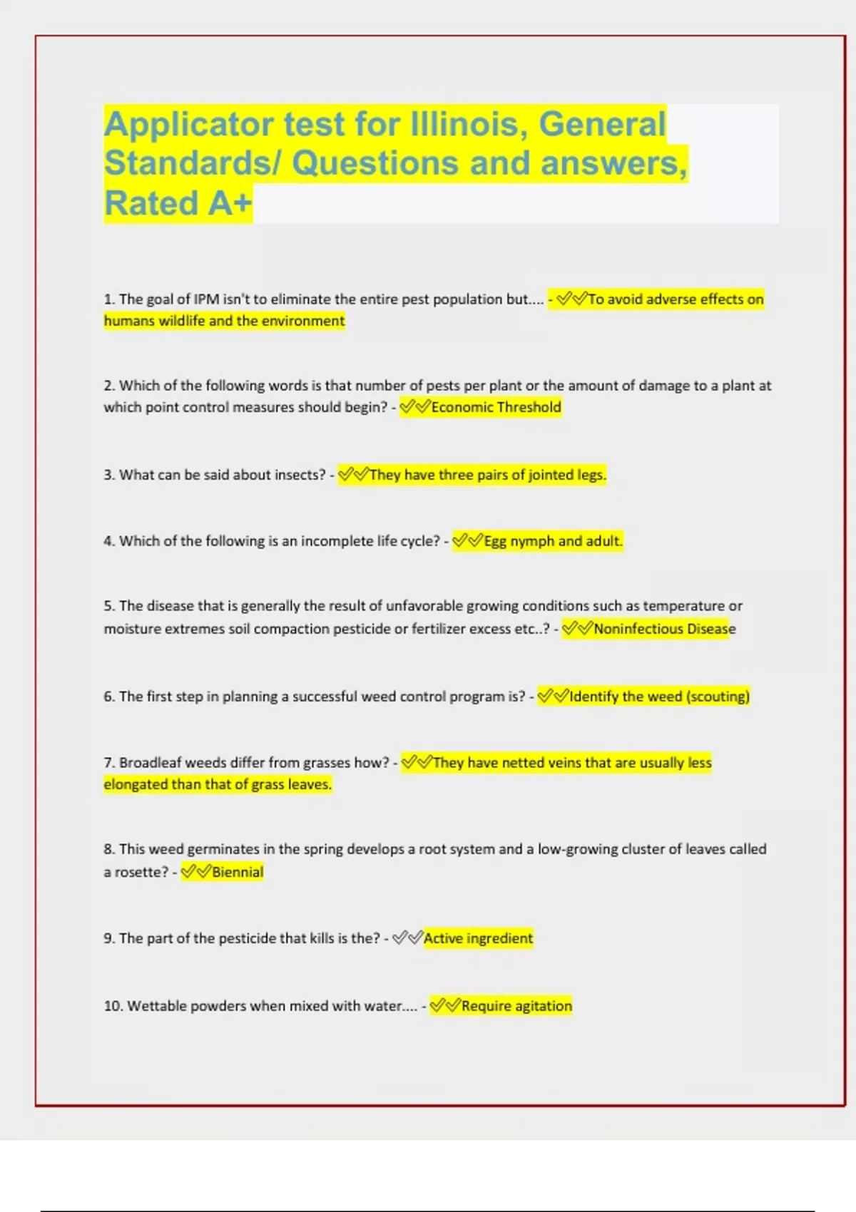 Illinois Pesticide Applicator Exam - General Standards, Questions and answers, rated A+[LATEST EXAM UPDATES]
