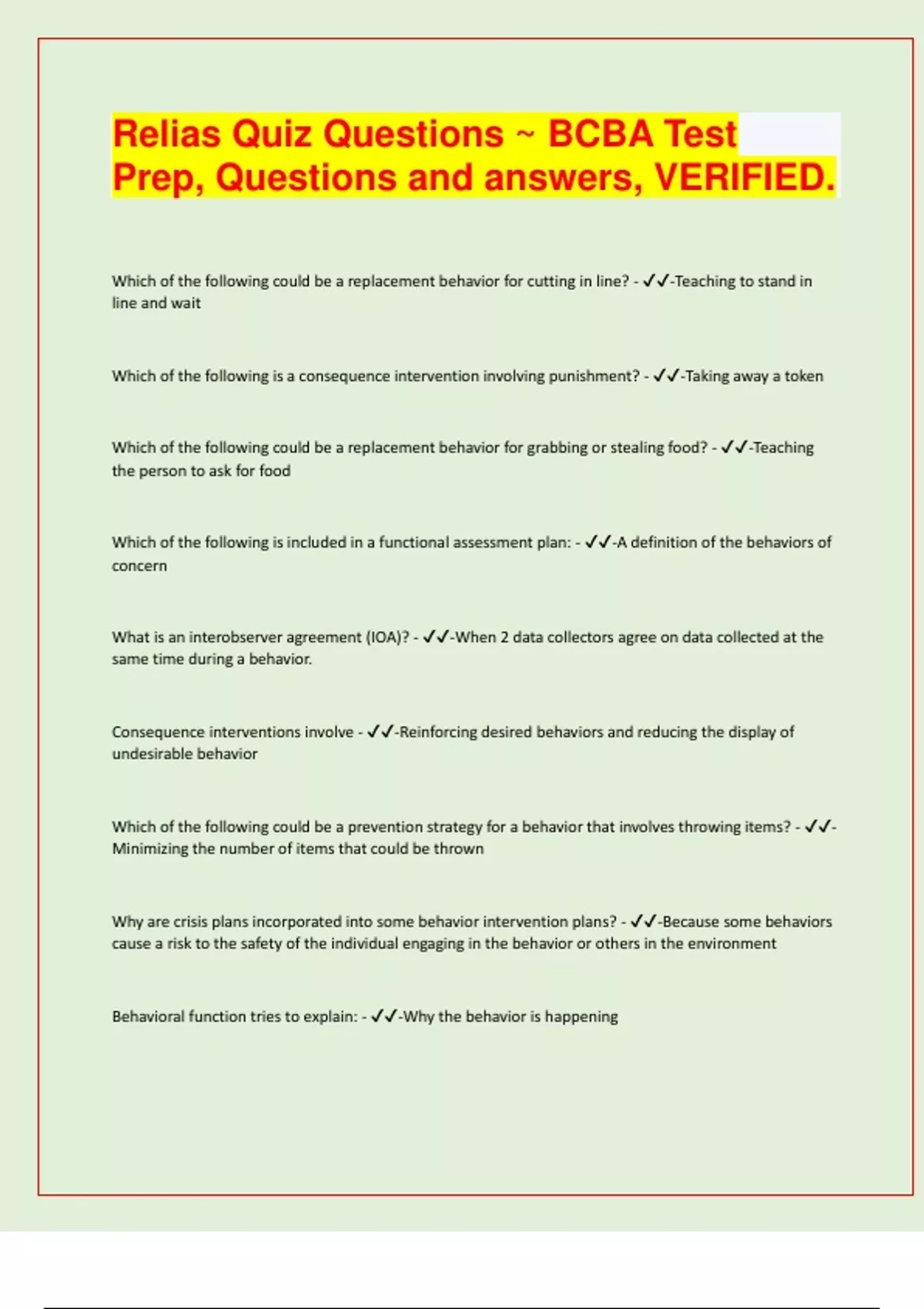 Relias Quiz Questions ~ BCBA Test Prep, Questions and answers, VERIFIED. latest 2024/25 exam prediction paper/ APPROVED.