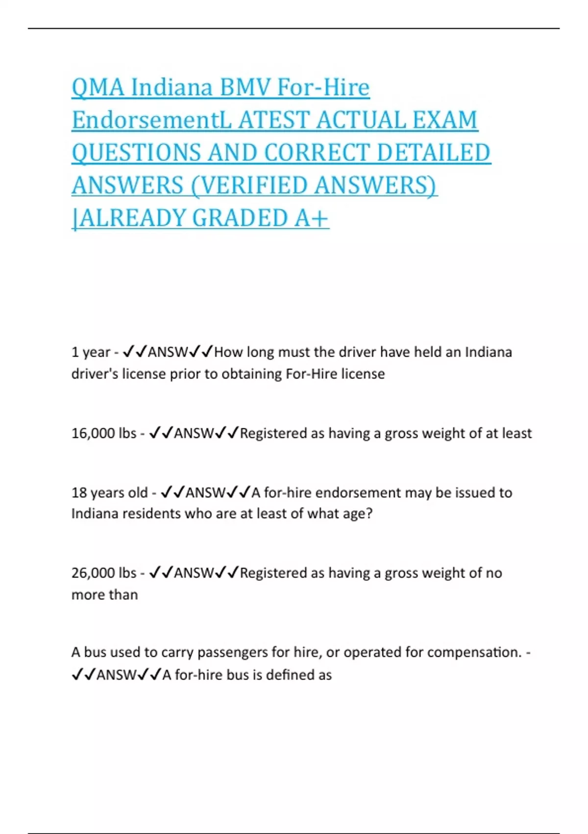 QMA Indiana BMV For-Hire EndorsementL ATEST ACTUAL EXAM QUESTIONS AND CORRECT DETAILED ANSWERS (VERIFIED ANSWERS) |ALREADY GRADED A+