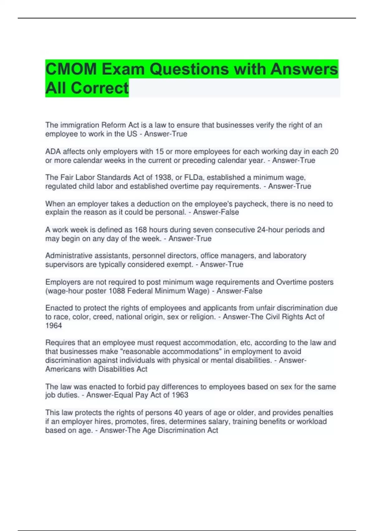 Bundle For CMOM Exam Questions with Answers All Correct