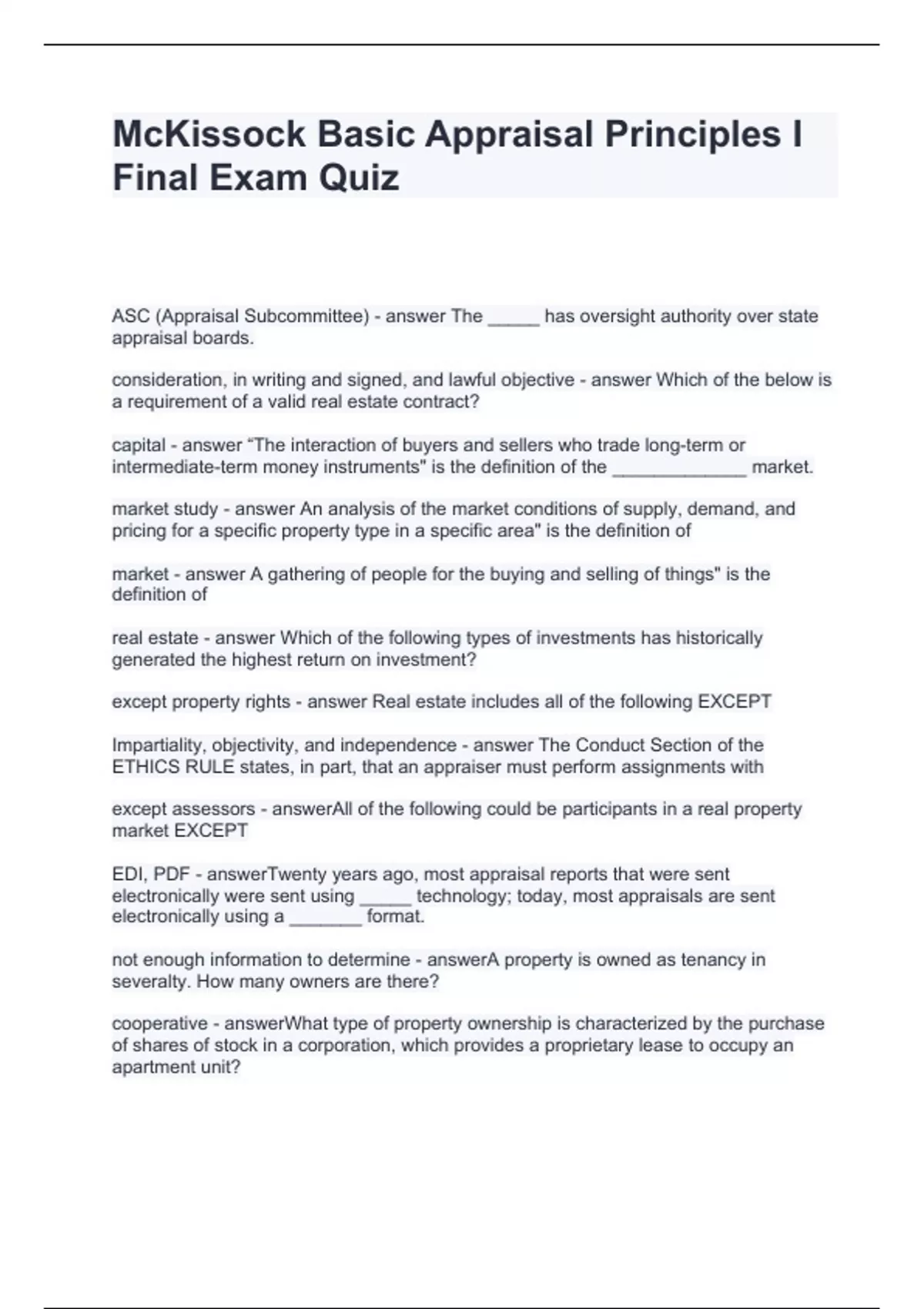 Exam (elaborations) Chapters 45-46 Homework Questions with correct Answers Exam (elaborations) Appraisal Principles Quizzes Questions and Answers Graded A+ Exam (elaborations) McKissock USPAP Chapter 9 Questions and Answers 2024 Exam (elaborations) Basic Appraisal Procedures Chapter 12 - Comprehensive Review Quiz Questions and Answers Exam