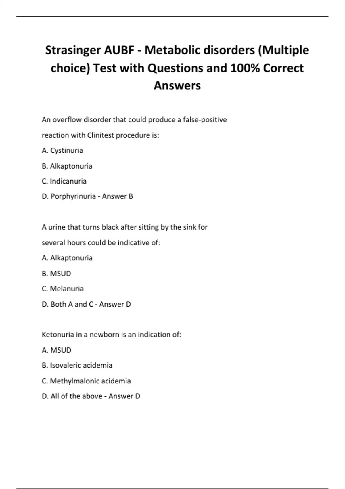 Strasinger AUBF - Metabolic disorders (Multiple choice) Test with Questions and 100% Correct Answers