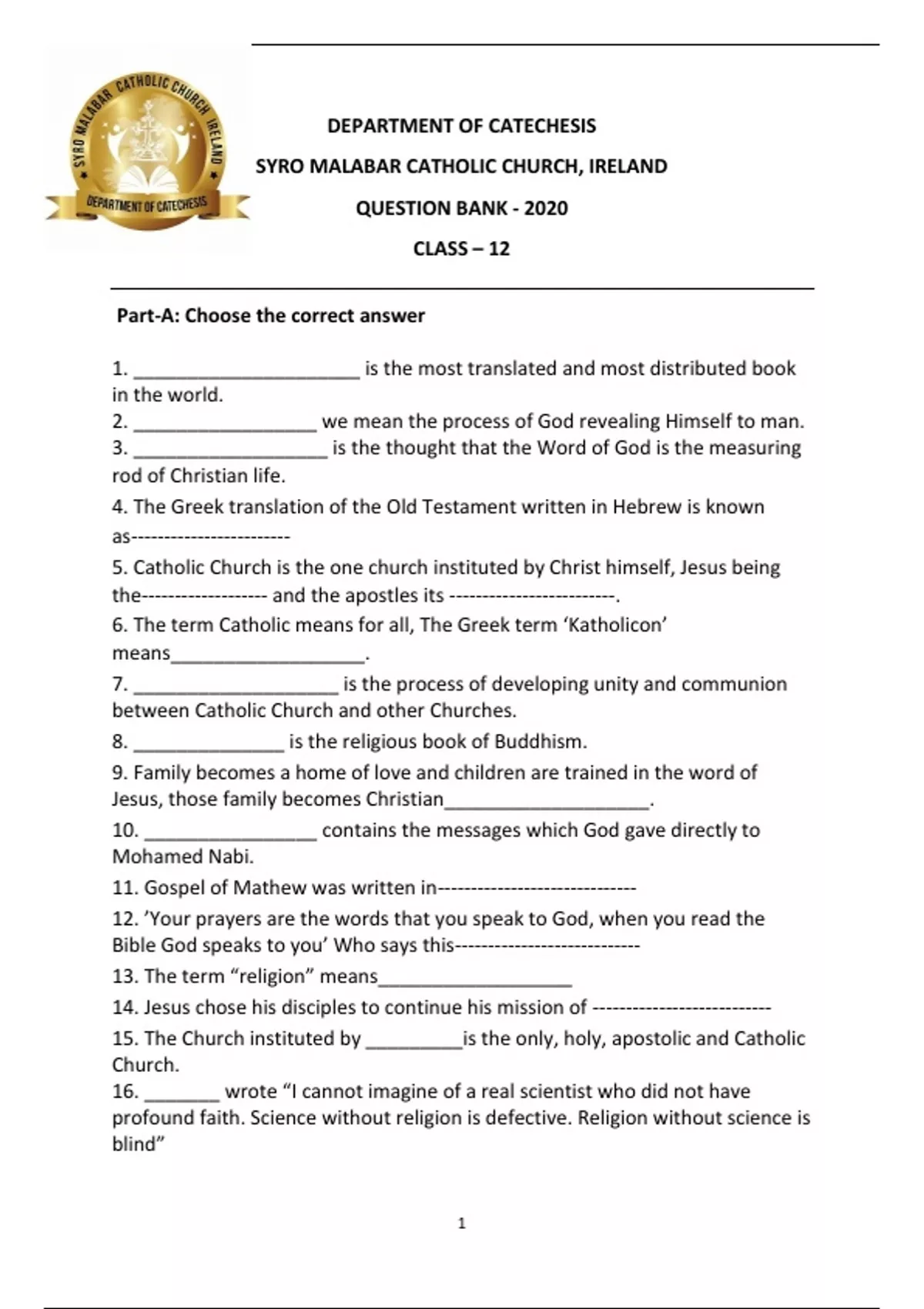 DEPARTMENT OF CATECHESIS SYRO MALABAR CATHOLIC CHURCH, IRELAND QUESTION BANK