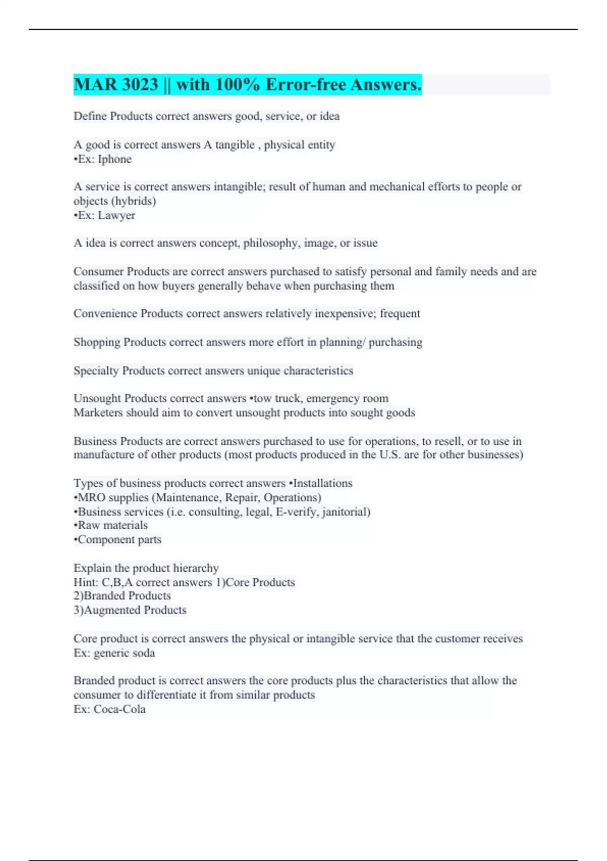MAR 3023 || A+ Guaranteed. MAR 3023 - Exam 1 (Ch 1-6, 10) || Already Graded A+. UCF MAR 3023 Exam 3 Review (Ch. 9 -12 Study Guide) || with Error-free Solutions. MAR 3023 UF Professor Cooke Exam 1 || with 100% Verified Solutions. MAR 3023 Marketing || Already Passed. MAR 3023 Final Guide || with 100% Errorless Answers. MAR 3023 FSU Exam 1 BRADY || w