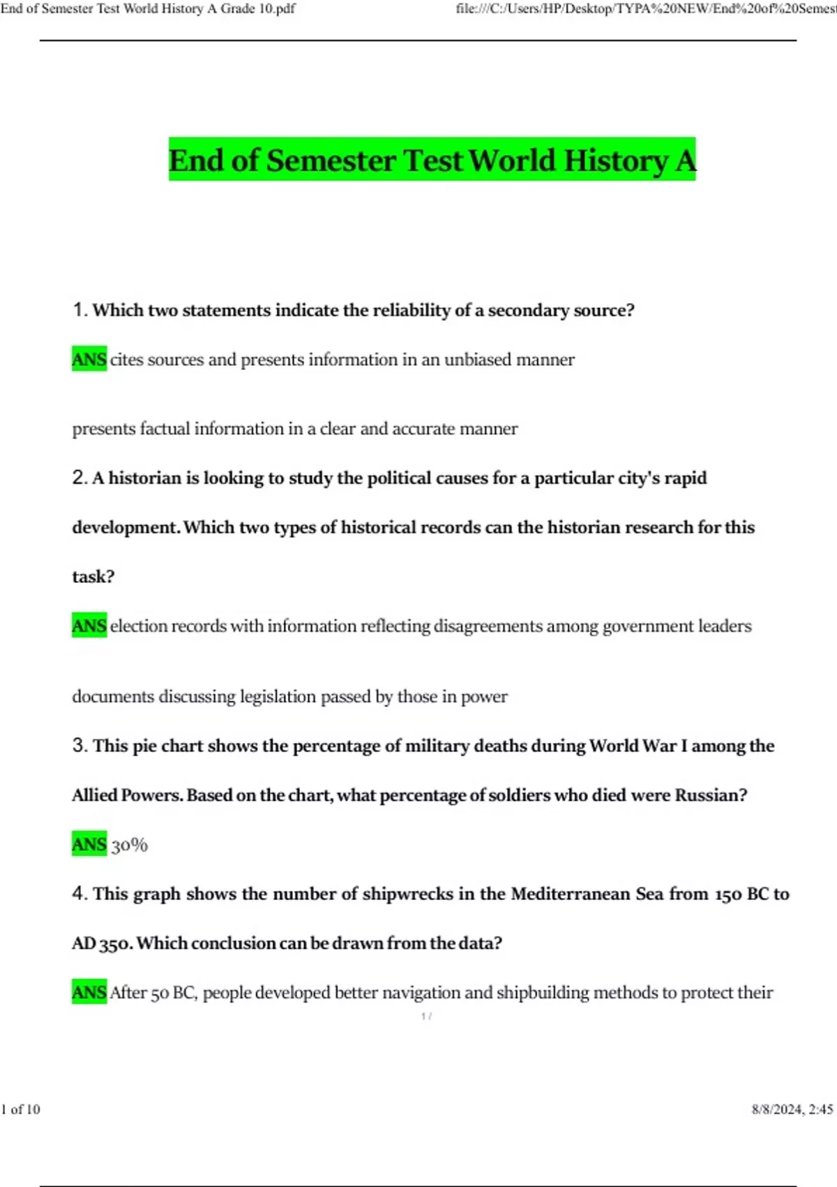 End of Semester Test BUNDLED END OF SEMESTER TEST WORLD HISTORY A&B End of Semester Test World History A (for Edmentum - Plato ) WITH 100% CORRECT ANSWERS EVERYTHING YOU NEED TO PASS