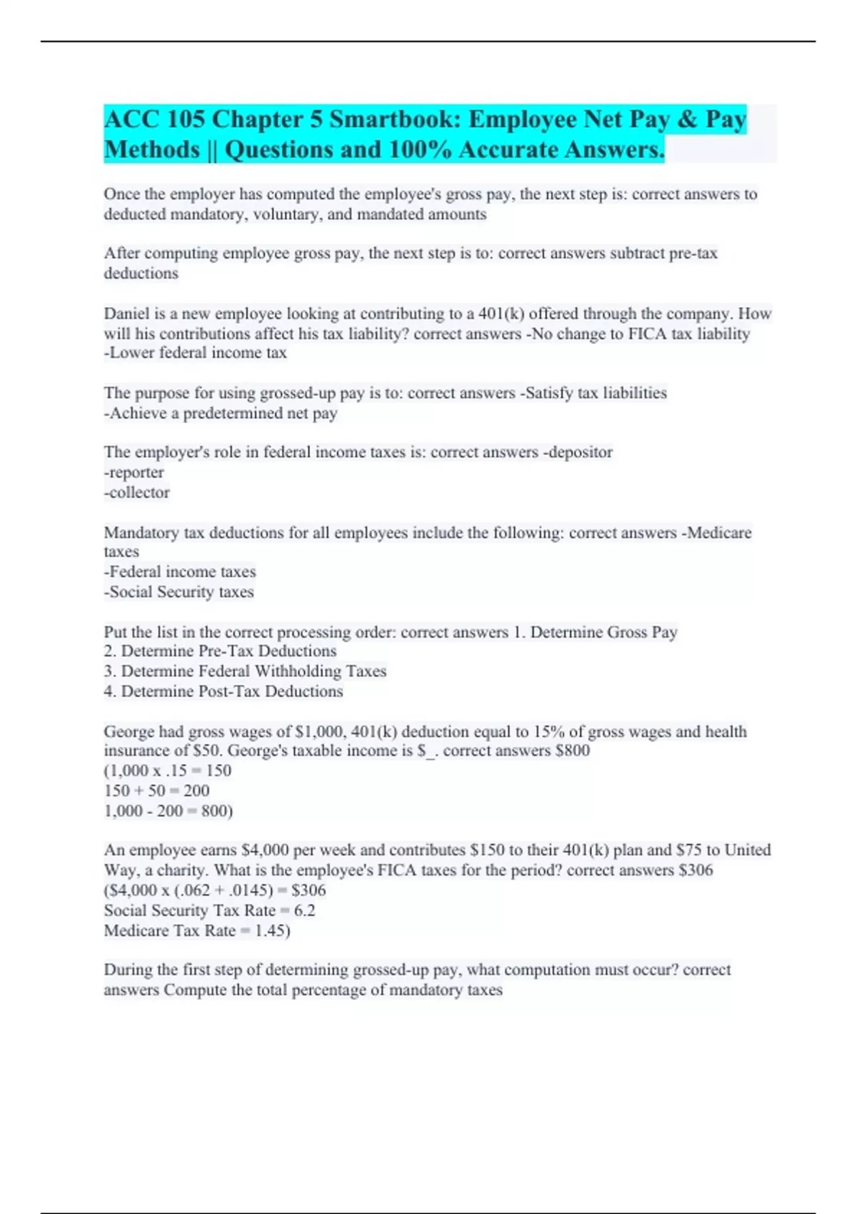 ACC105 Chapter 5 || A Verified A+ Pass. ACC 105 - Chapter 1 || with Error-free Solutions. ACC 105 - Chapter 2 || Already Graded A+. ACC 105 - Chapter 3 || A+ Verified Solutions. ACC 105 Chapter 5 Smartbook: Employee Net Pay & Pay Methods || Questions and 100% Accurate Answers. ACC 105 Final Exam || All Correct. ACCT 105 Exam 1 || with Errorless Sol