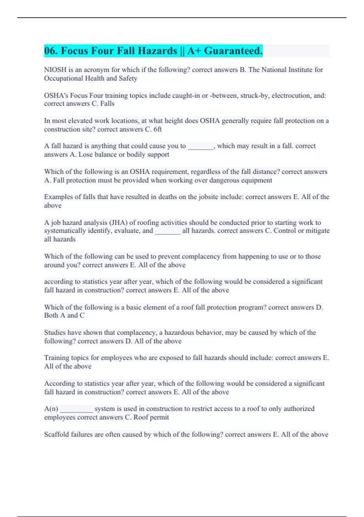 Navy Fall Protection Awareness Training for End Users Working at Heights and Supervisors of End Users || with 100% Verified Solutions. 06. Focus Four Fall Hazards || A+ Guaranteed. Assignment 14 - Falls, Fall Protection, Slip, Trips & Falls || with 100% Errorless Solutions. Fall hazards || A+ Verified Solutions. Fall Protection || with 100% Correct