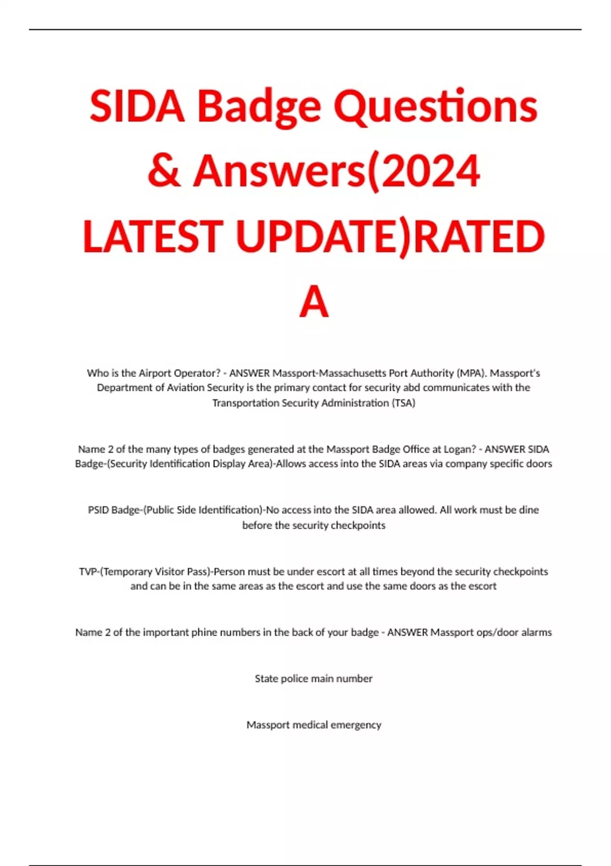 SIDA Badge Questions & Answers(2024 LATEST UPDATE)RATED EXAM BUNDLE
