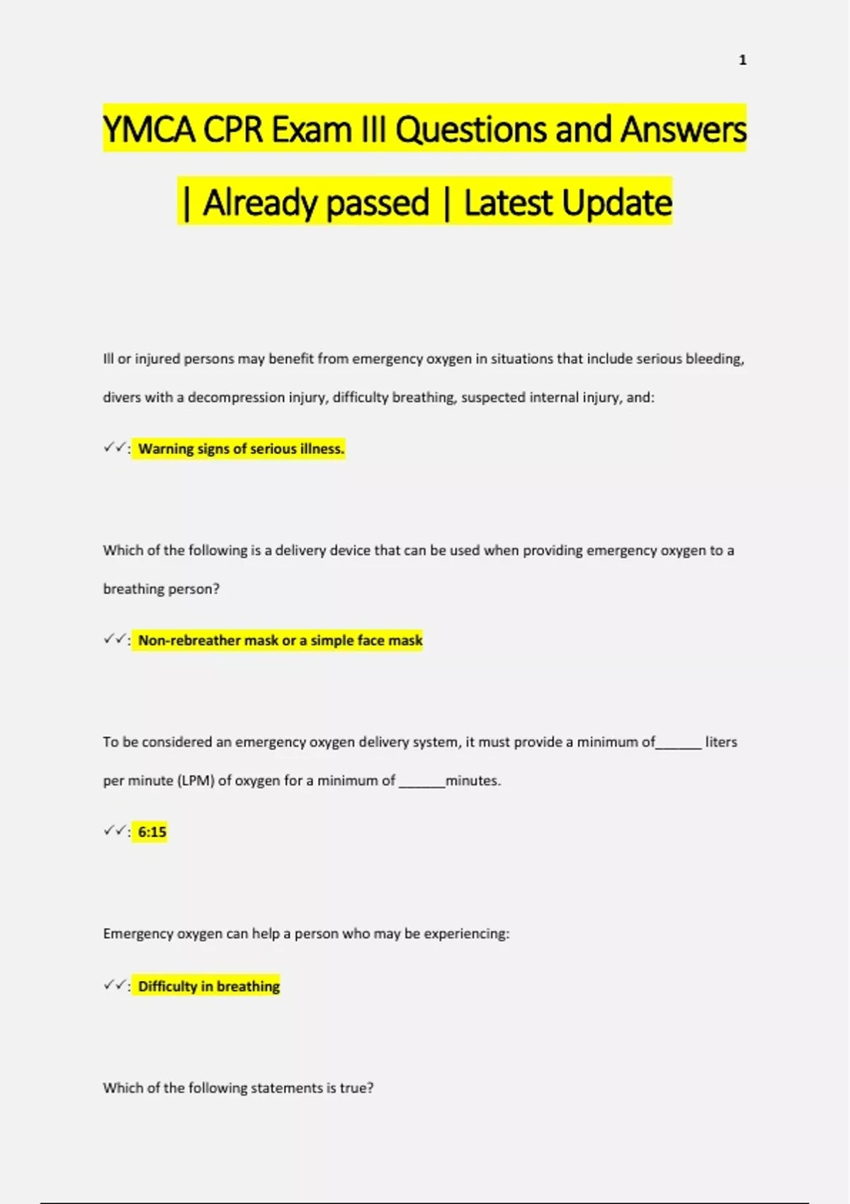 YMCA CPR Questions and Answers | Already passed | Latest Update