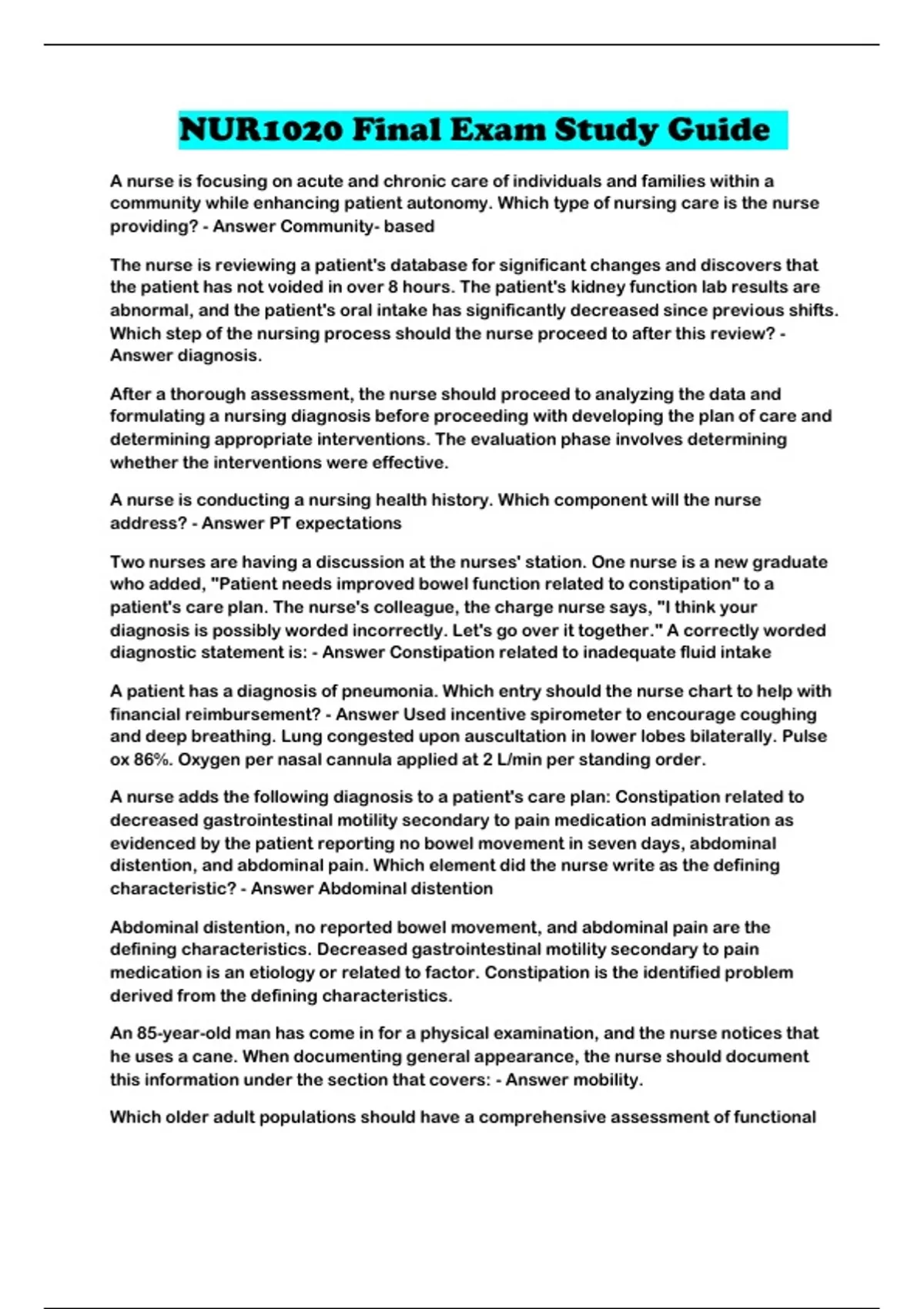 NUR1020 Final Exam Study Guide
