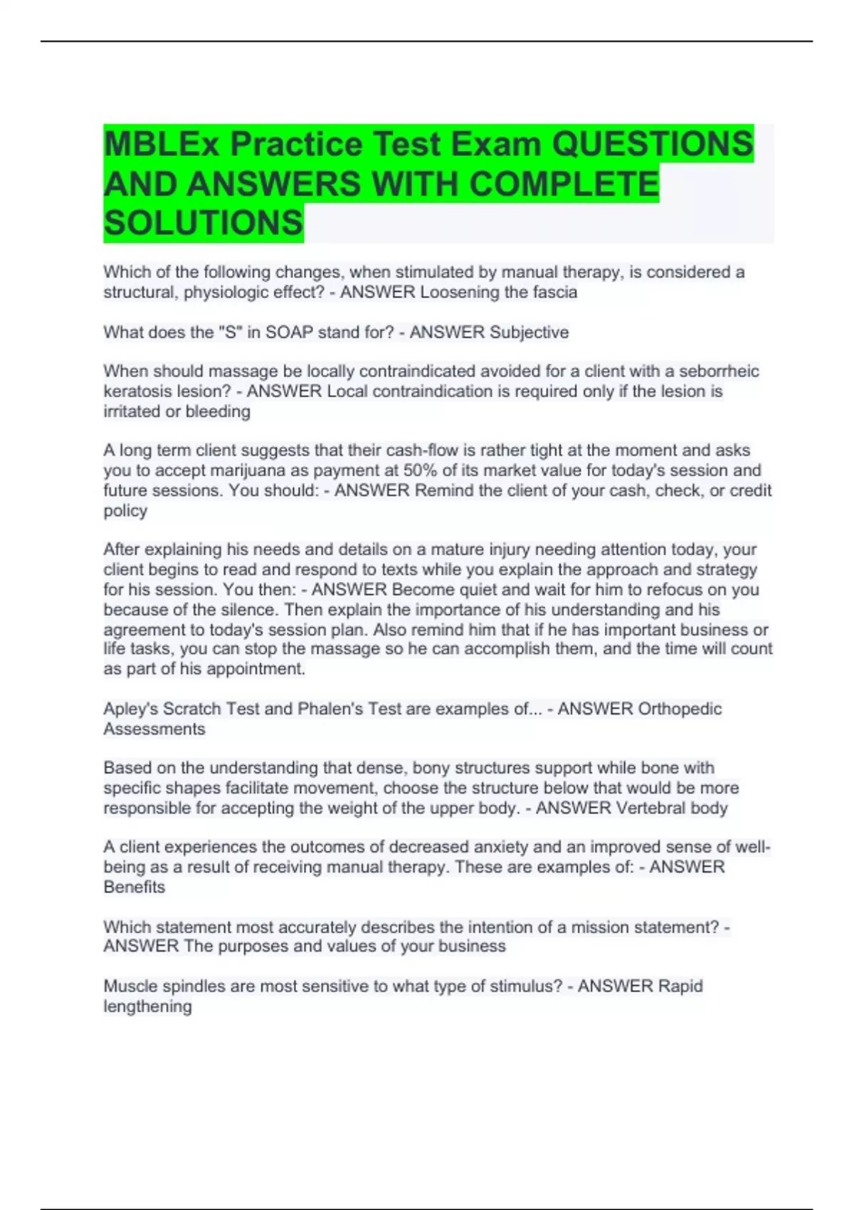 MBLEX Prep; Questions & Answers 100% Verified 2 Exam (elaborations) MBLEx sample Questions & Answers 100% Verified 3 Exam (elaborations) MBLEx Part 5 Physiological effects of Massage; Questions & Answers 100% Verified 4 Exam (elaborations) MBLEx Content; Questions & Answers 100% Verified 5 Exam (elaborations) MBLEx Practice Test; Questions & An