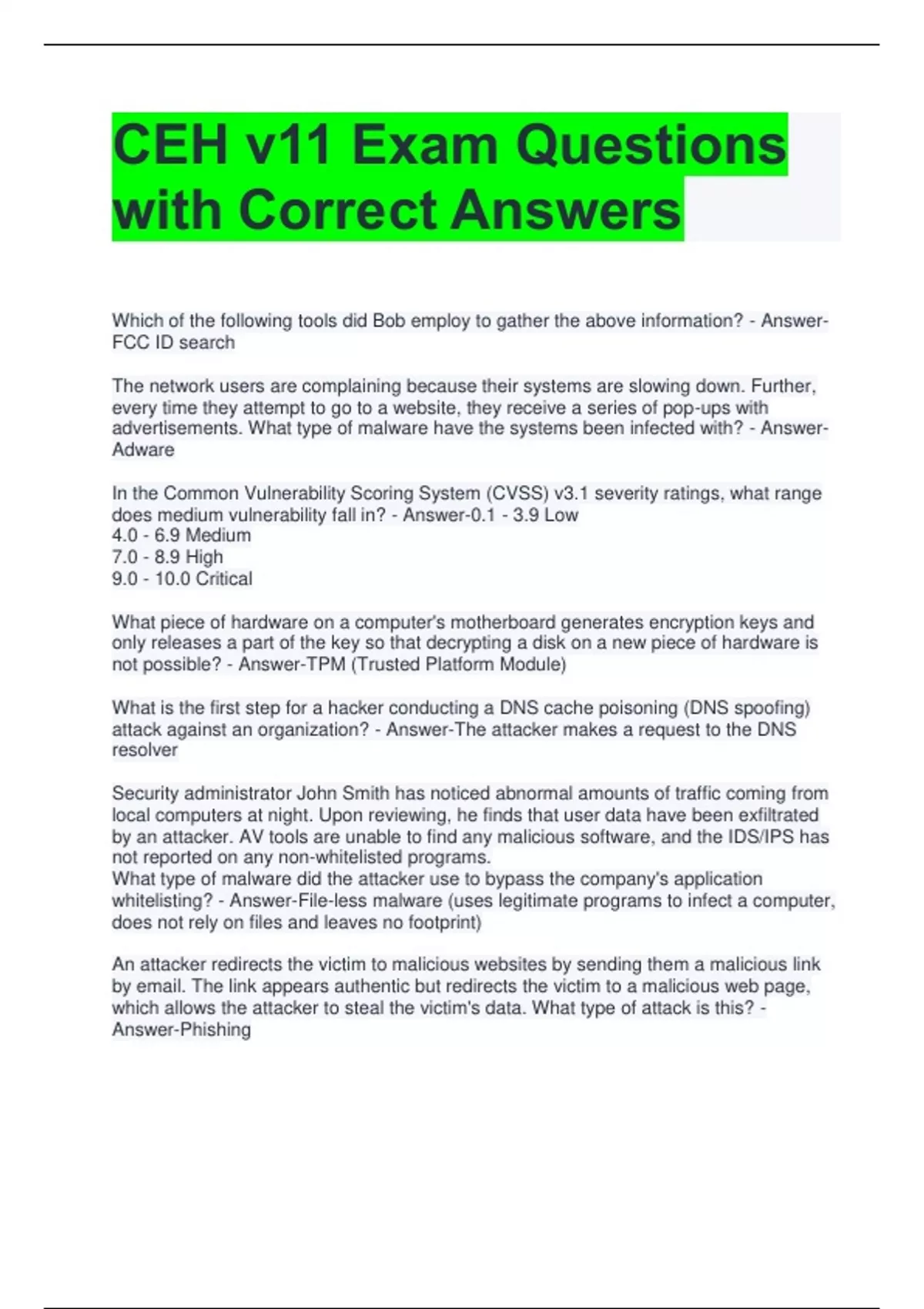 CEH v11 Exam Questions with Correct Answers 2 Exam (elaborations) CEH v11 2024 Exam Questions with A Grade Solution 3 Exam (elaborations) CEH v11 Practice Test Questions with Correct Answers 4 Exam (elaborations) CEH v11 Test Questions with Correct Answers 5 Exam (elaborations) CEH v11 Practice Test with Complete Solutions 6 Exam (elaborations