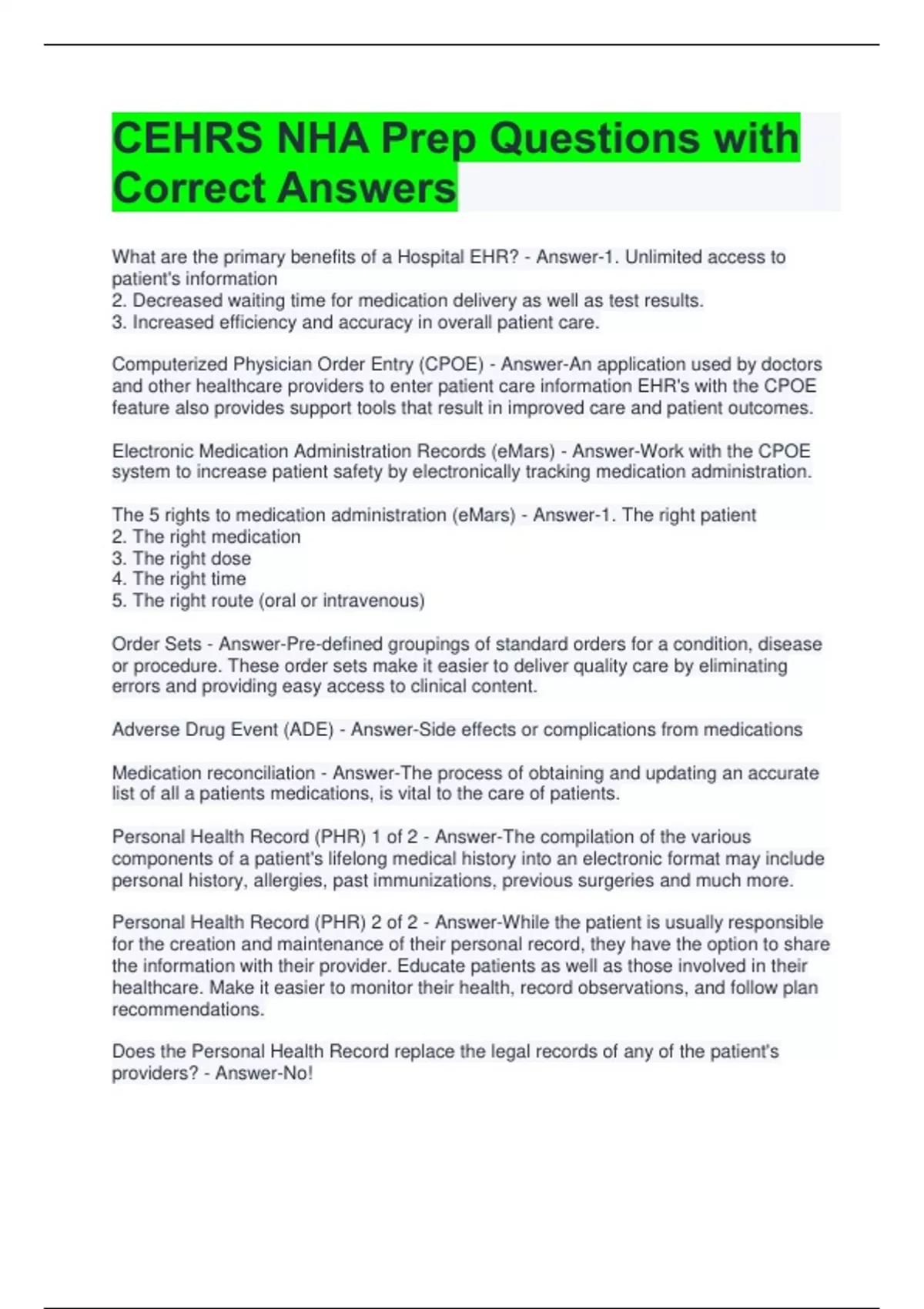 CEHRS NHA Prep Questions with Correct Answers 2 Exam (elaborations) CEHRS NHA Chapter 1 Exam Questions with Correct Answers 3 Exam (elaborations) NHA CEHRS Study Questions with Answers All Correct 4 Exam (elaborations) NHA CEHRS STUDY TEST QUESTIONS WITH ANSWERS 5 Exam (elaborations) NHA CEHRS Practice Test with Complete Solutions 6 Exam (elab
