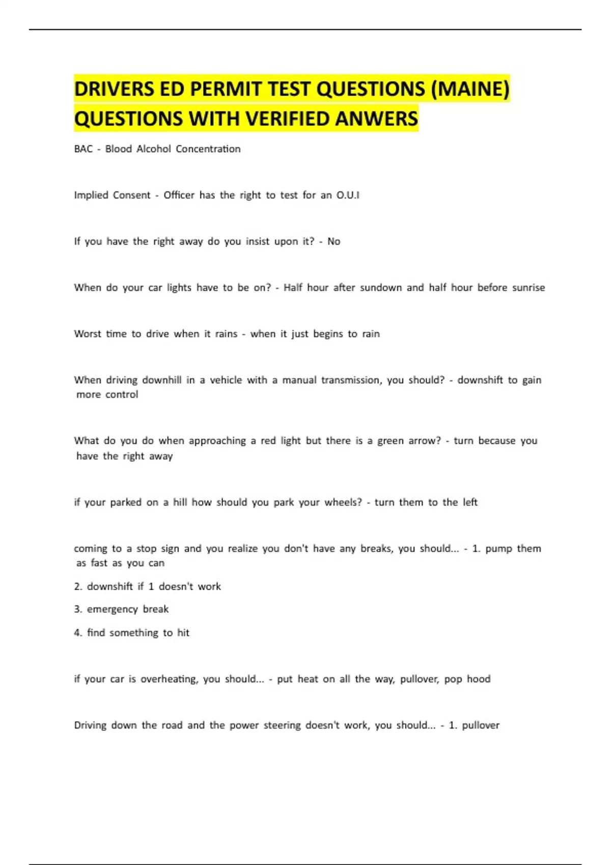 1 Exam (elaborations) Drivers ED Permit test questions (Maine) 2 Exam (elaborations) Drivers Ed: Maine s Motorist Handbook and Study Guide parts 1-3