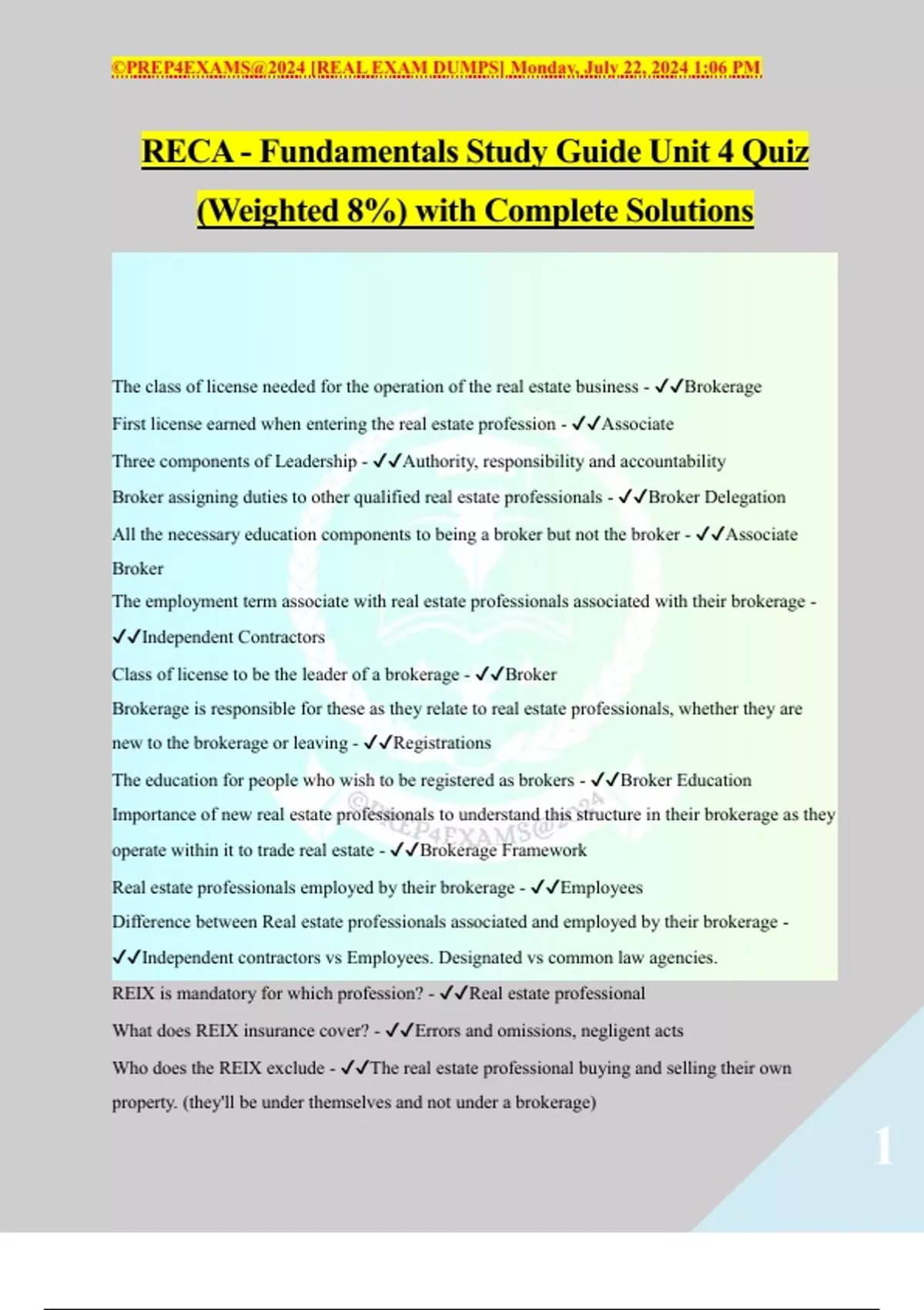 RECA - Fundamentals Study Guide Unit 4 Quiz (Weighted 8%) with Complete Solutions