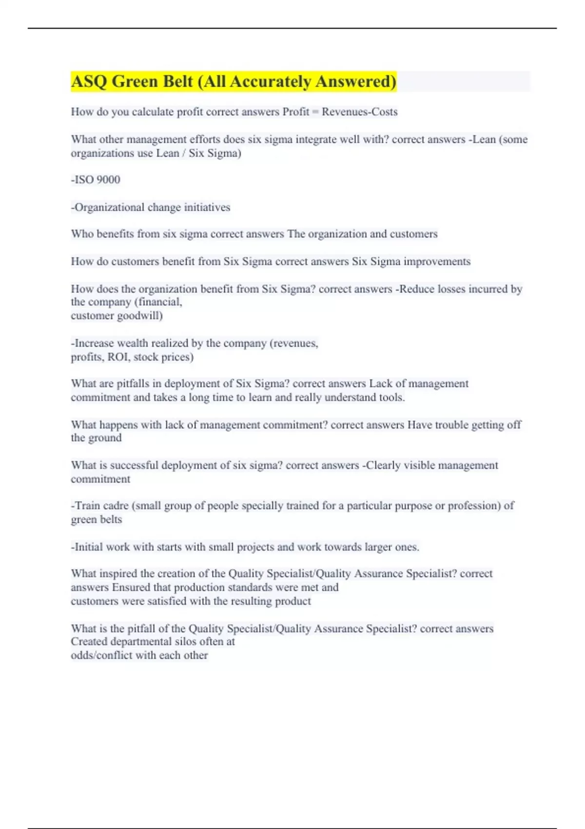 CQE - Sample Exam – ASQ || Questions and 100% Accurate Answers. ASQ - Ch 11 - Quality System (P. 260 - 278) || with Accurate Answers 100%. ASQ - Ch 8 - Management Skills & Abilities (P 132 - 198) || with 100% Error-free Answers. ASQ BlackBelt || A+ Guaranteed. ASQ CSSBB: Enterprise wide Deployment || with 100% Error-free Solutions. ASQ Green Belt (