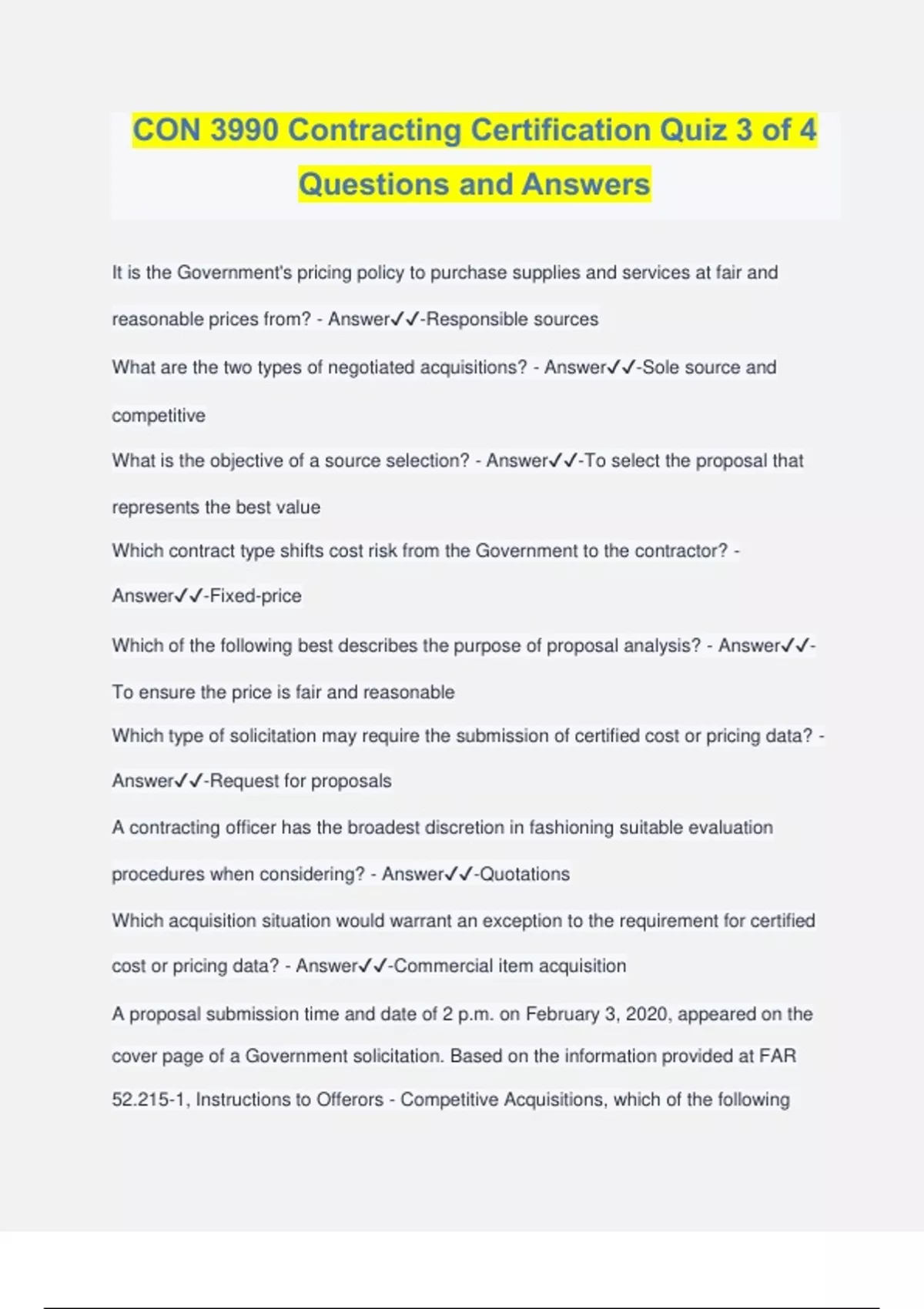 CON 3990 Contracting Certification Quiz 3 of 4 Questions and Answers