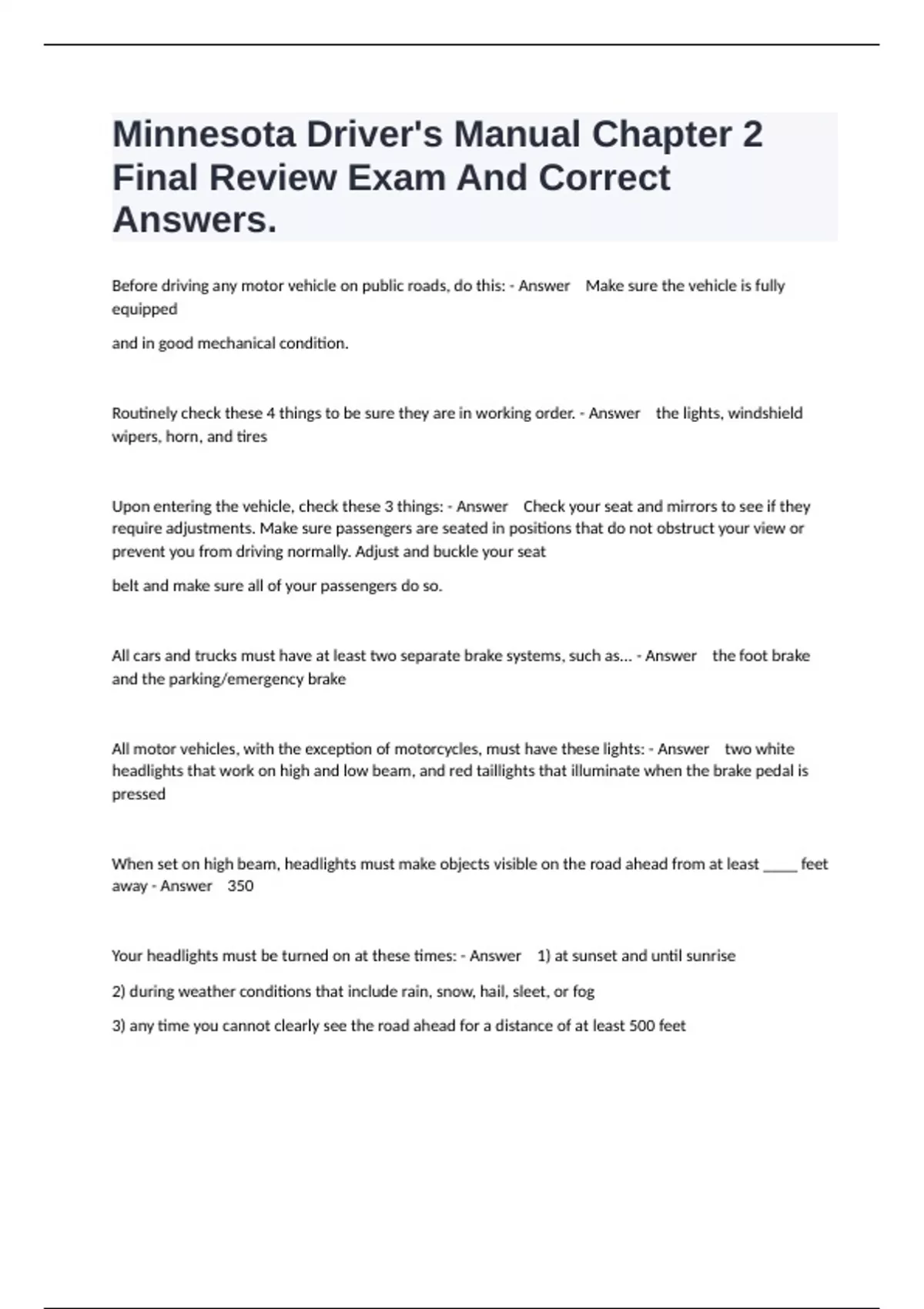 1 Exam (elaborations) Chapter 7 Minnesota Driver s Manual Prep Exam Questions And Guaranteed Pass Solutions. 2 Exam (elaborations) Drivers Ed Minnesota Assignment Exam Questions Solved Correctly. 3 Exam (elaborations) Minnesota Driver s Final Review Exam With Verified Solutions.