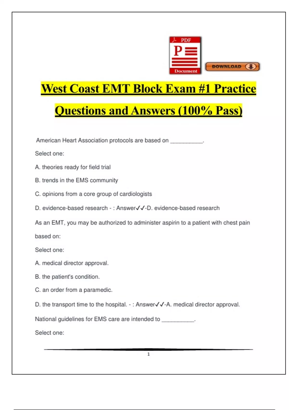 West Coast EMT Block 1 Exam Practice Questions and Answers (100% Pass)