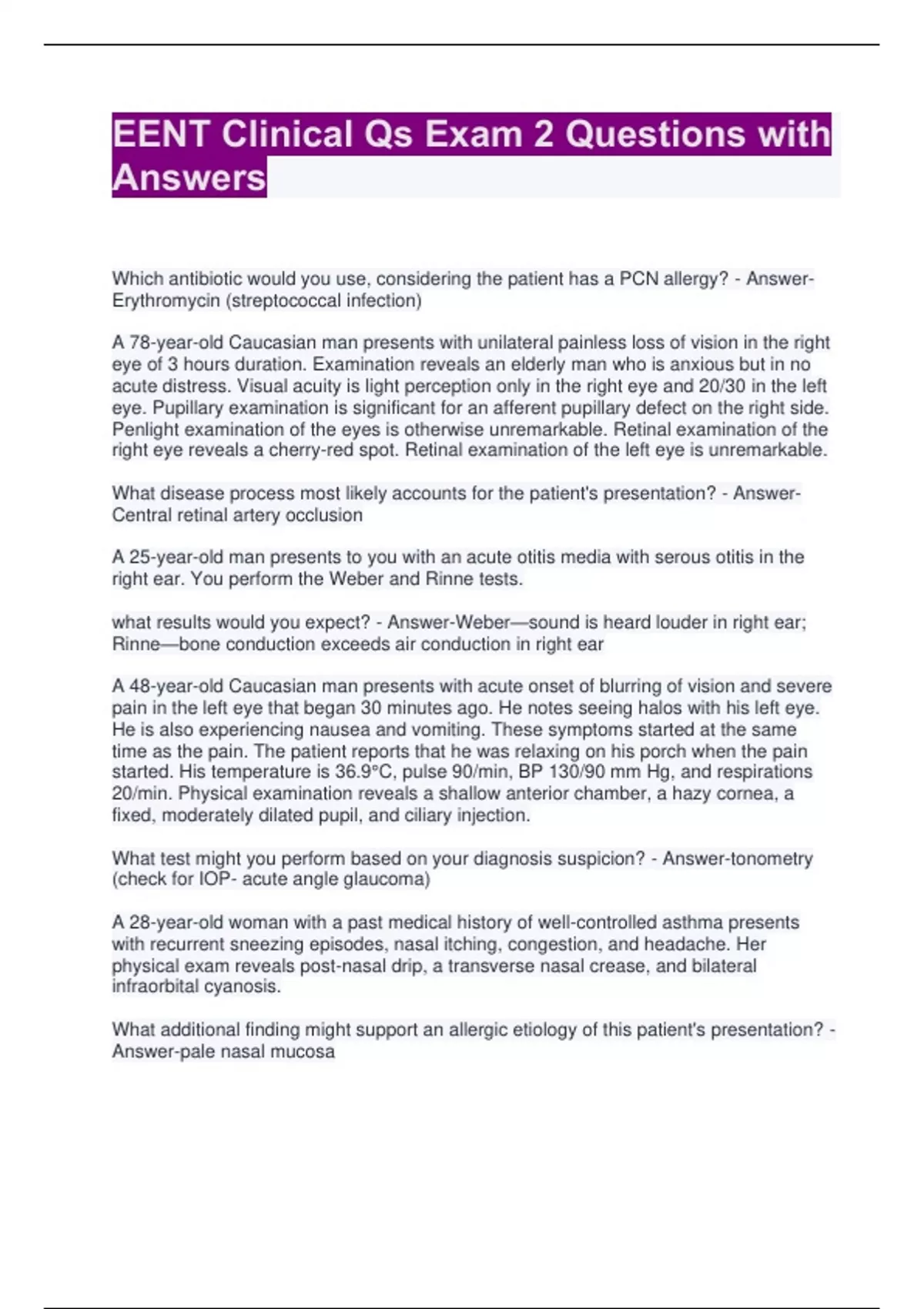 EENT Clinic Entrance Test Questions and Answers 2 Exam (elaborations) EENT Clinical Clin Med Exam 2 Questions with Answers 3 Exam (elaborations) EENT Clinical Qs Exam 2 Questions with Answers 4 Exam (elaborations) EENT LCCW Cranial Nerve Review Test Questions and Answers 5 Exam (elaborations) EENT LCCW Final Test Questions and Answers 6 Exam (