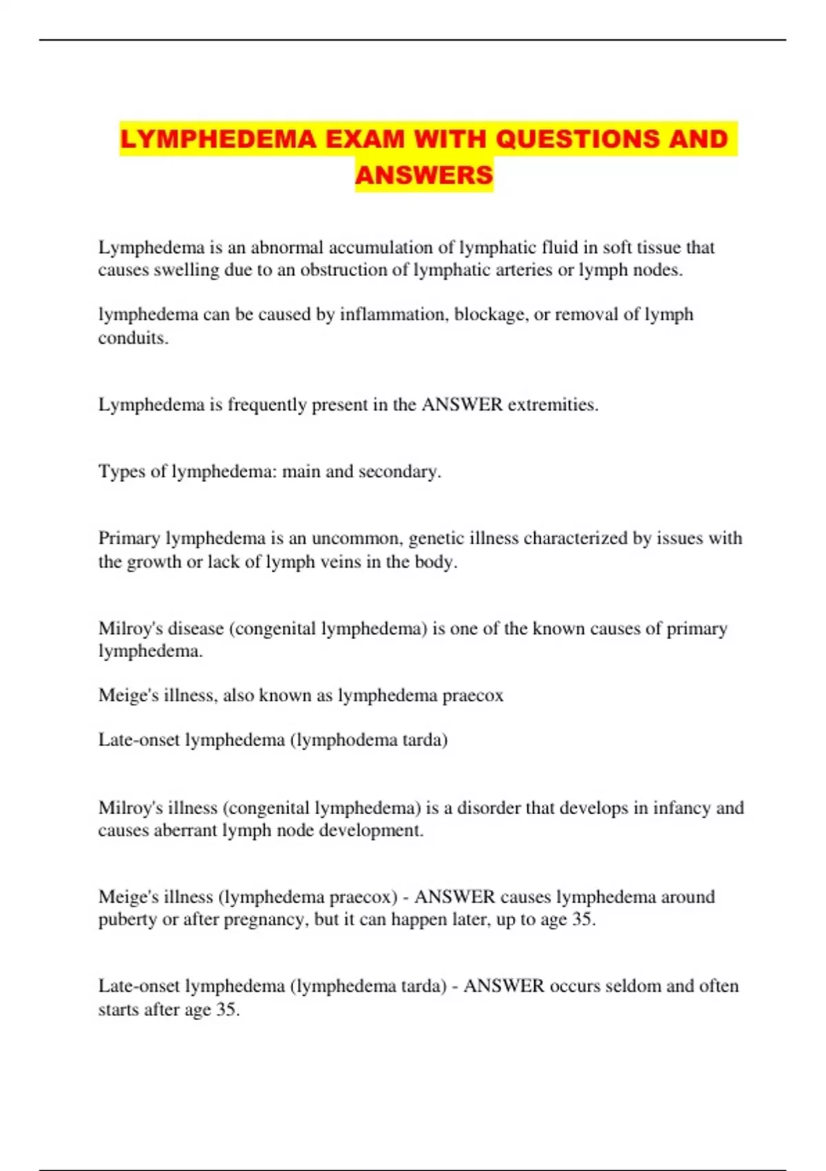 LYMPHEDEMA EXAM WITH QUESTIONS AND ANSWERS