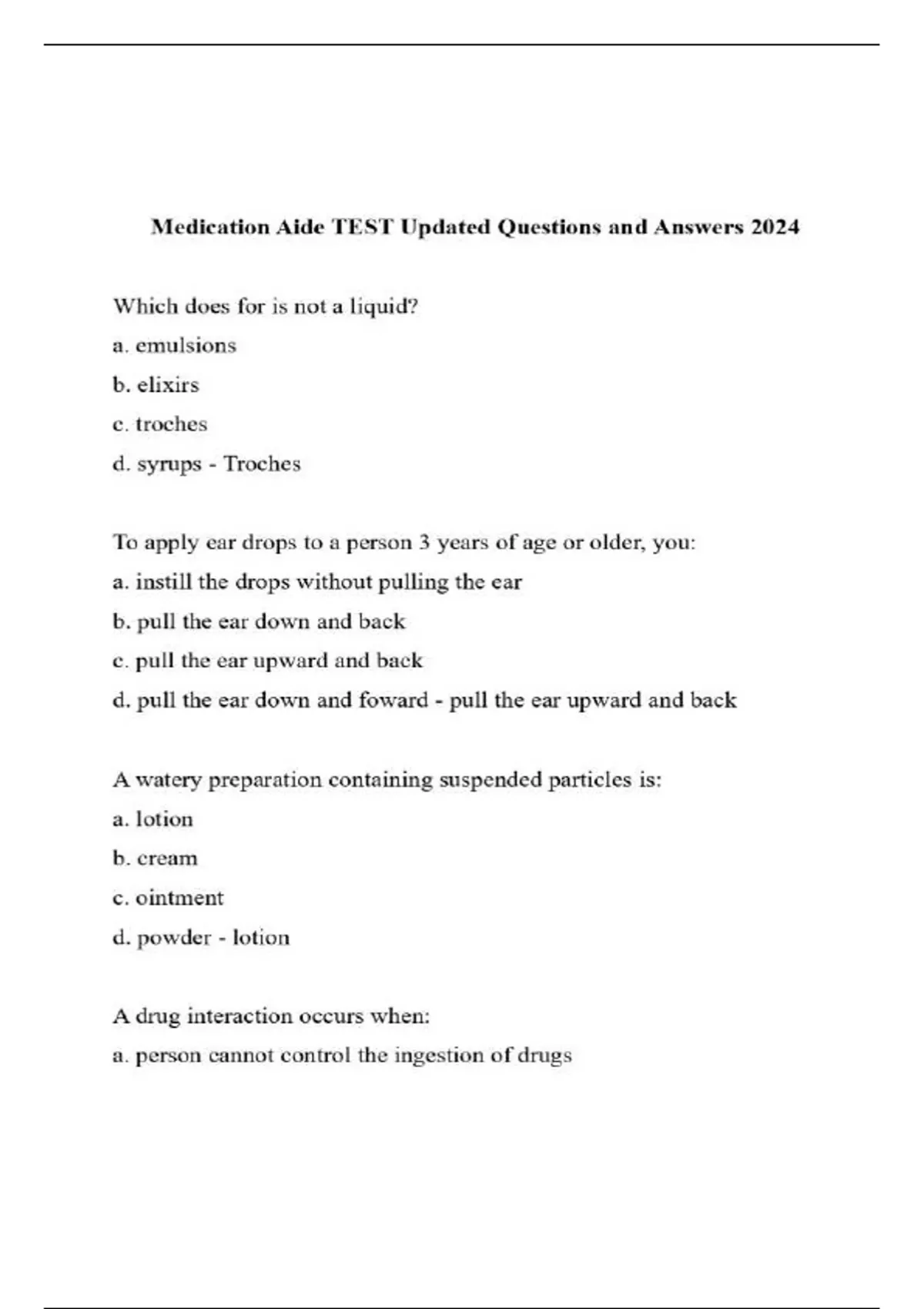 Medication Aide TEST Updated Questions and Answers 2024