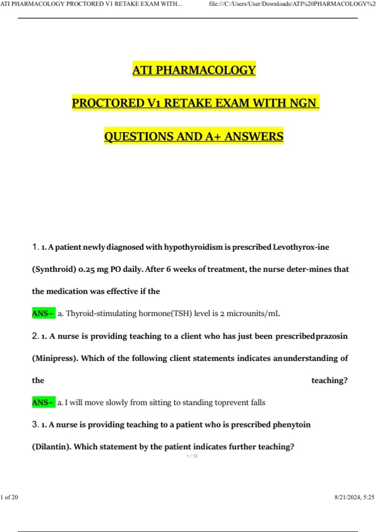 ATI PHARMACOLOGY PROCTORED RETAKE EXAM 3 VERSIONS (PACKAGE DEAL) WITH NGN QUESTIONS AND A+ VERIFIED ANSWERS