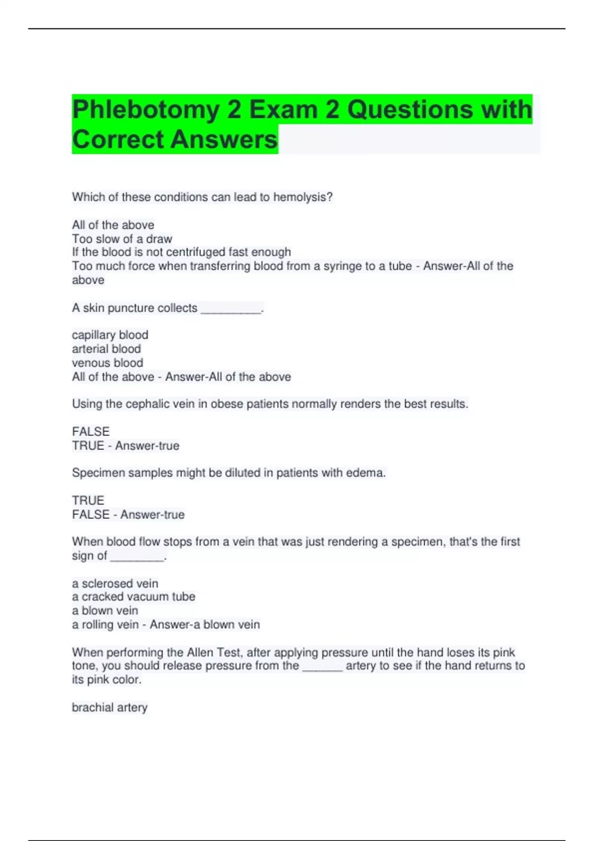 Phlebotomy 2 Exam 2 Questions with Correct Answers 2 Exam (elaborations) Phlebotomy Exam Questions with Correct Answers 3 Exam (elaborations) Phlebotomy Chapter 1 Quiz with Correct Answers 4 Exam (elaborations) Phlebotomy Practice Test Questions and Answers 5 Exam (elaborations) Phlebotomy Test Questions with Complete Answers 6 Exam (elaborati