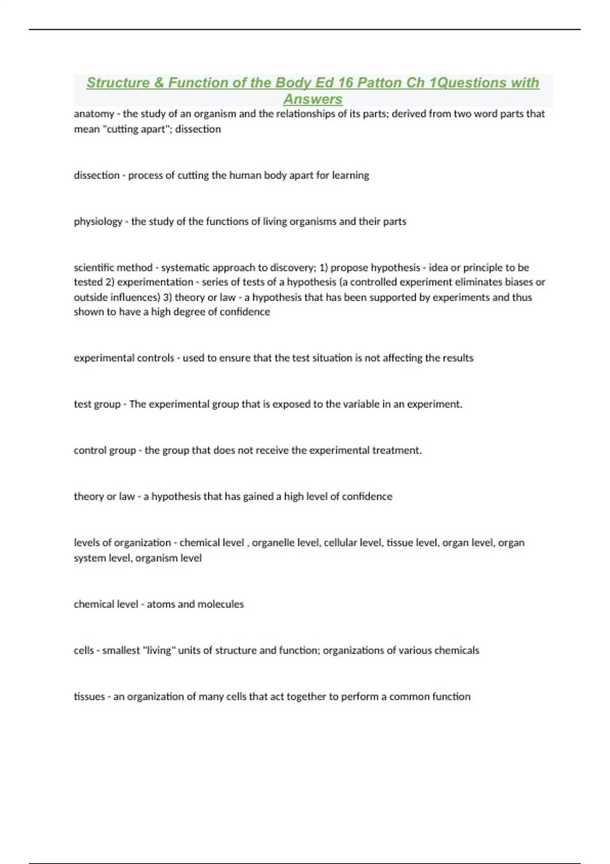 Structure and Function of the Body Ed 16 Patton Ch 1 Guide Questions with Answers anatomy - correct answers the study of an organism and the relationships of its parts; derived from two word parts that mean "cutting apart"; dissection dissection - correct answers process of cutting the human body apart for learning physiology - correct answers th